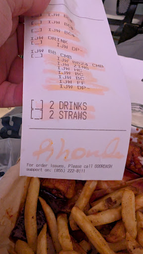 Man oh man. Let's see. I ordered it's just wings for dinner via doordash last night. I got the 16 count bone-in wings for myself and my son to split 8/8 with different sauces. When it arrived, the wings were overcooked and dry. I mean CRUNCHY. They also didn't split the sauces (they just dumped a pile of wings in the box and overly sauced it with Asian sauce). Whatever, I complained and got a refund through doordash for the mistake ($5 was all they gave me back. Doesn't even cover what they messed up). Well my son threw a fit. After eating one wing he didn't like the sauce that they used on all of them. He wanted his sauce that they had forgotten. We wound up throwing the meal away and making box Mac and Cheese.. so to make him happy I ordered wings today. This time we tried a boneless 24 pack, hoping they wouldn't be overcooked. We split the sauces again. 12 and 12 with a bunch of blue cheese. Two drinks as well. Well it arrived. I got 12 wings overly sauced in the same container as the fries. Not 24 wings, but 12. Half my entire order is missing this time. They didn't just forget to sauce it. They never sent it out the kitchen. The best part? Because they messed up yesterday, I don't qualify for a refund today on the doordash app. I've made 5 orders total on this app. I'm not someone sitting here scamming for free food. It's not my fault the wing cook can't read. I'm done giving Wingstop/Chilis my time of day and money. Looks like I'm not the only one in these reviews angry with y'all. You ticked me off, but overall your inability to do your job has left a kid disappointed two days in a row. The order was checked by Rhonda and hand signed as well. Ill post the receipt. Why even bother to "check it" if you aren't going to read the ticket? I mean every single line on this ticket is highlighted as if she actually checked it. Yet half the entire order failed to make it out of your store. It seems to me like Rhonda's eyes are what really need to be checked.