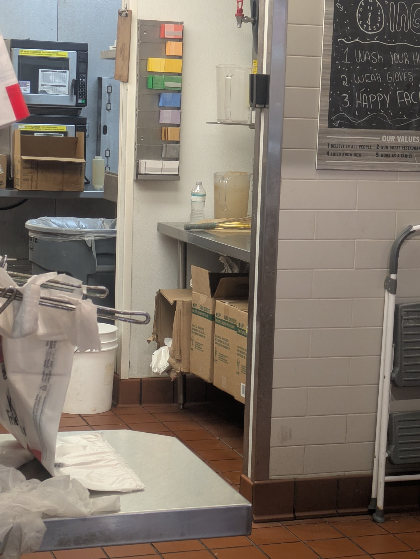 The restaurant is filthy—food safety violations everywhere. Open water bottles sitting on prep tables, employees only wearing one glove while handling food, and cross-contamination happening right in front of me. The bathroom is disgusting—no soap, dirty, just completely unsanitary. Even the expo station had used gloves lying around.