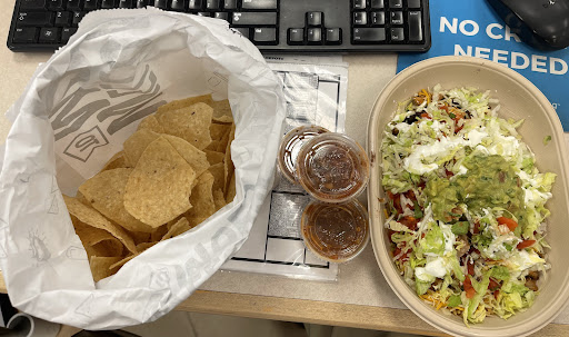 After walking in and seeing how old the black beans were (noting that half of the container had a caked on layer of black beans that appeared to be sitting for hours on in) I proceeded to give an employee my order. After witnessing the employee touch numerous food items and meats with a gloved hand (cross contamination), the food was bundled up and passed along to another employee. After waiting a total of five minutes, the next employee finally took my food (this employee took her time in restocking the food that was there without even noticing myself standing there) and scrapped from the bottom of a container cheese that had been bunched up. The burrito was then wrapped and then passed on to another employee. After seeing another customer not receive the totality of what that customer ordered, I was then asked if I wanted anything else in which I responded for queso. This queso container was no bigger than a tablespoon. The salsa bar was not maintained and look sloppy (I am an avid spicy salsa eater and I did not even touch this salsa.) I contemplated going and eating outside because upon looking at the dining room I saw food, chips, salsa, and napkins under the tables which looked to be uncleaned and not at least wiped off. After searching for a clean table, I sat down and took a bite of a chip, a stale, unsalted, unflavored chip that was only made edible with a heaping mound of warm queso which did little to heat up the cold "fresh" chips. My burrito (Joey Bag of Doughnuts) which had chicken, black beans, rice, and cheese, was not only cold (for it sat for five minutes on the food preparation line) but also greasy and had not the first bit of typical southwest flavor to it. I was unable to finish this bland "bag" of beans and old meat and cheese and cold rice for after the first bite I had a thick, gritty, after-taste in my mouth. I was accompanied by a family member who ordered tacos. These tacos were, after a few minutes of attempting to eat them, soggy and not crispy. Though I must add, when I heard them bite into the taco at the beginning of the meal there was no crunch - and as they described there was not even remotely the first ounce of flavor. Upon driving home, after five minutes, I experienced a crippling and sharp stabbing pain below my stomach. I am now afraid I have food poising from this establishment. I was hopeful that this restaurant would be delicious, for it has been open no more than six months, but unfortunately I cannot even stand up now due to the pains that I am experiencing below my stomach. I am used to eating this type of food frequently, but I am not used to eating poor quality substances that have the title of "food" frequently. Please, please, please, avoid...