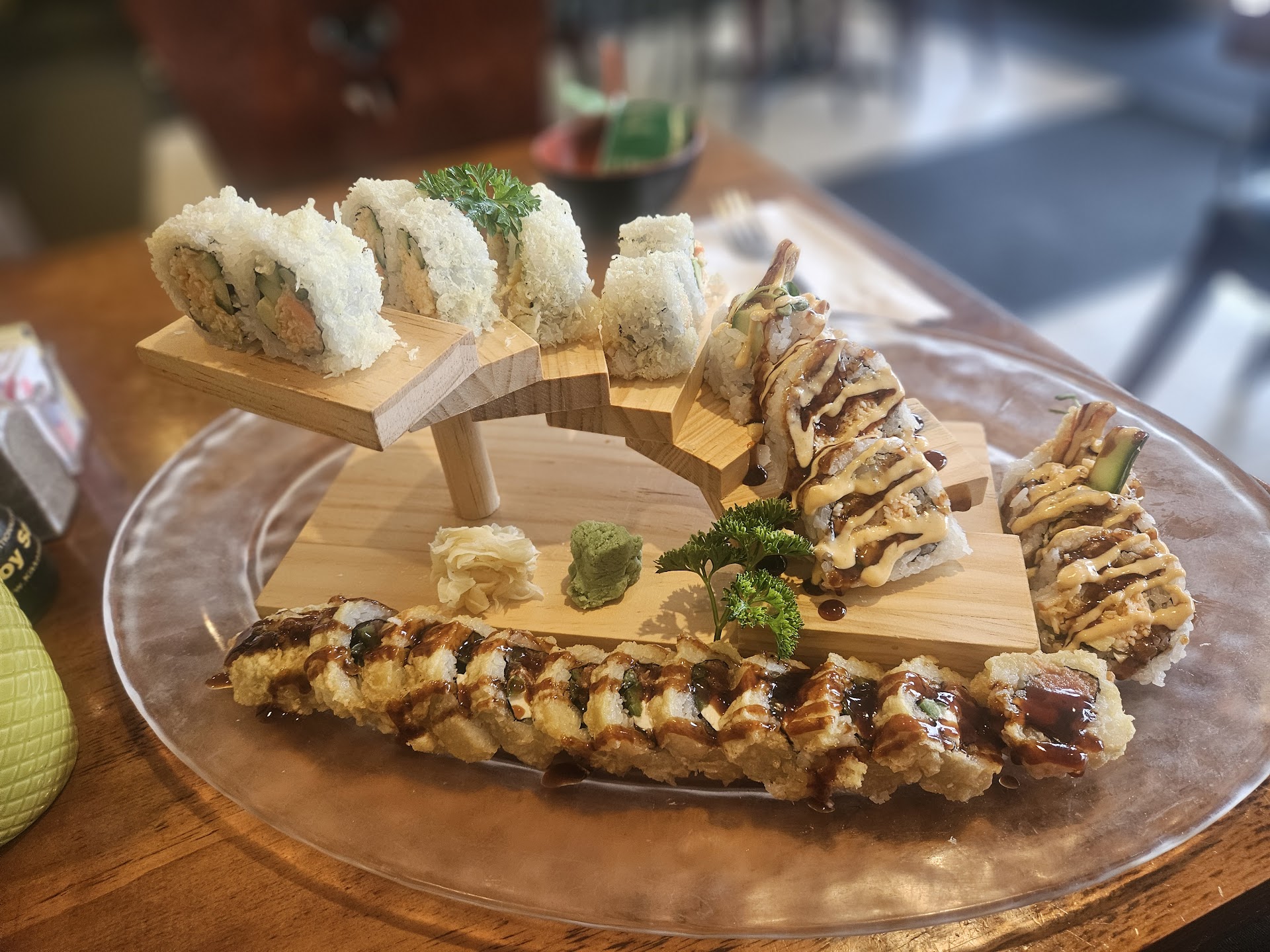 I read about the services in the reviews, and I am going to have to say all of those reviews are accurate. That's a bad sign when I read more than a handful of reviews about bad service, and then the place confirms that information. When we walked in, there were two flustered girls at the front counter putting together to go orders. They ignored us for a few minutes until one of the sushi chefs at the bar motioned to us to pick a place to sit. That was irritating, considering as soon as we sat, the girls started greeting everyone who came in after us cheerfully. Our waitress came over almost immediately and asked if we were ready to order, and luckily, we were, but I would assume most people aren't ready to order immediately. She forgot to ask us what we wanted to drink and had to circle back around with that question. Basically, I can confirm, if they're busy, the service is spotty.
