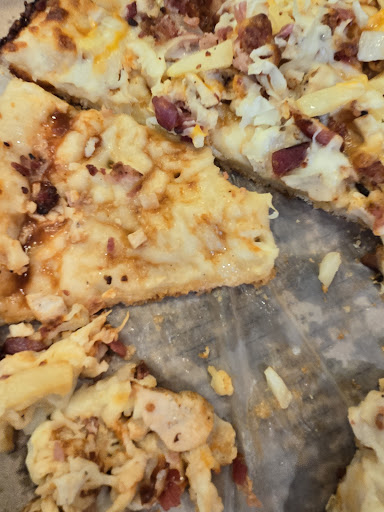 When I got down to the store, I showed the guy the pizza and he pointed to where the crust statted of the piece that I had peeled all the cheese off and said "See, look, BBQ sauce" I told him that I was not disputing that there was NO BBQ, just that there was barley any. He told me the BBQ had soaked into the dough.. what?! it most definitely did not.