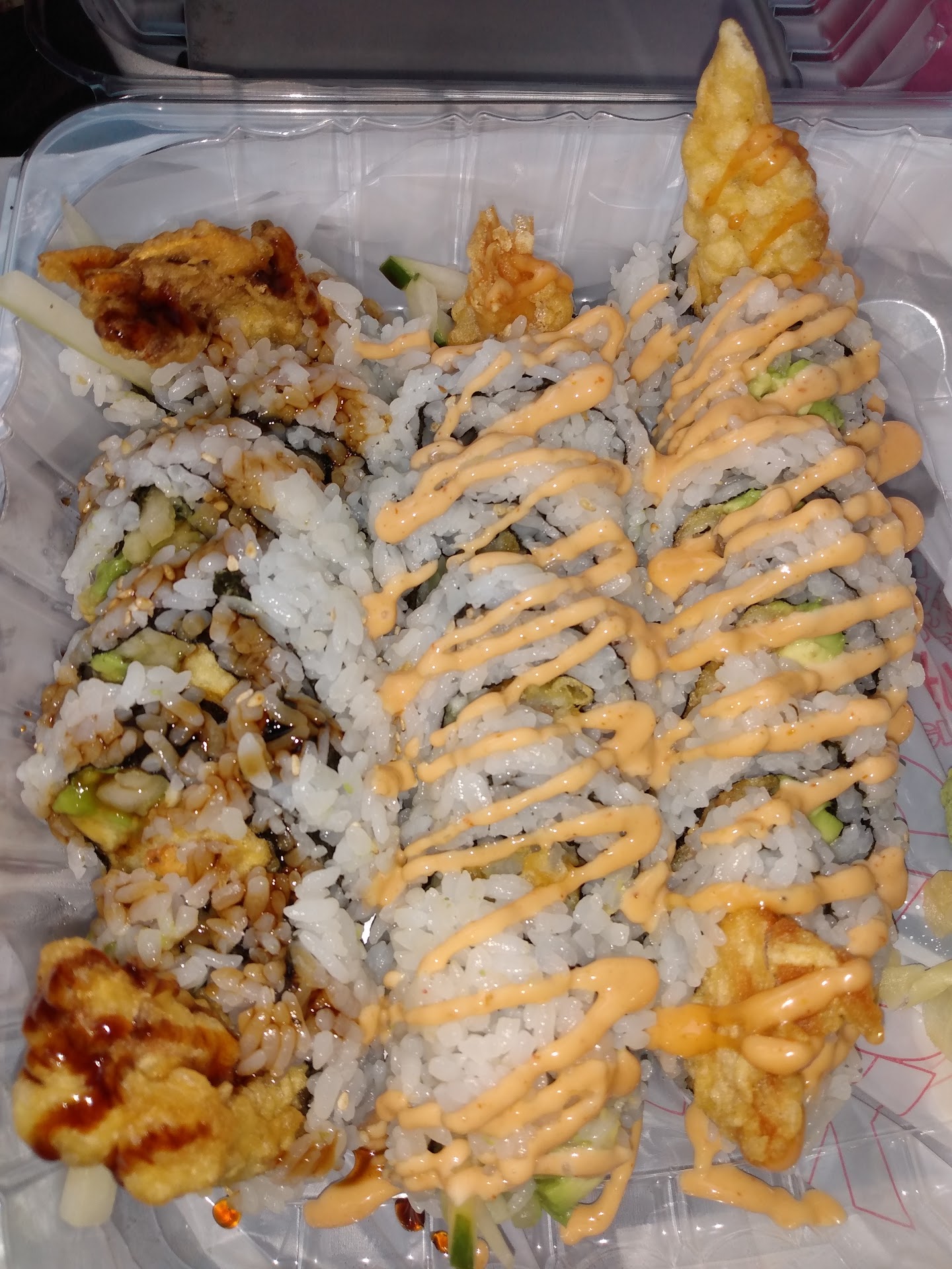 She brings out the roll she was making and it is just rice with slices of eel. I said its supposed to be on top of a California roll. She then got mad at me and said no. She's not doing that. She gave me the bagwith two boxes. When I opened the other box there was the spicy salmon roll.... with a California roll covered in eel sauce without the eel. I just left. I tried to eat it but ended up throwing it away because it was awful!!