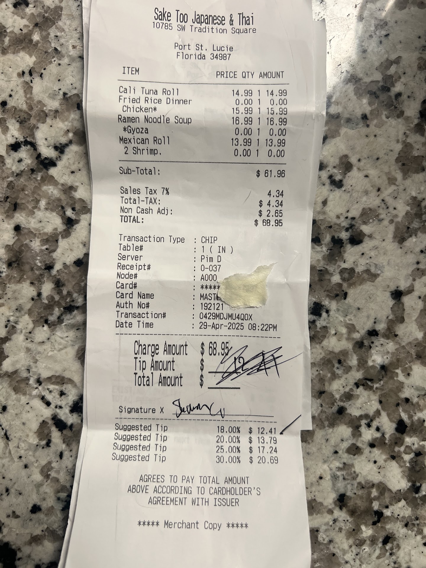 So let me start out by saying the one star review is entirely for what I experienced tonight, the food is pretty good. This is my second time here.. So me & my kids dined in tonight (sat outside). We had the fried rice, ramen noodles and some sushi rolls and the food was great. I asked for the check & some to go boxes. I sent my teenage son in the restaurant with my debit card to pay for our meal, when he came back outside, he gave me a copy of the receipt, I said well I need to sign the receipt and put a tip, he said he did. He signed his name, but never filled in the tip or total. So I walked inside & said hey can I have my receipt? My son said he signed it, but he never left a tip, I'm so sorry. So a tall slender asian woman with black hair and a pink top (also my waitress), handed me my receipt but right before she did she scratched out something on it. So when I started to review it, I realize it said $12.71, which was one of the suggestions of gratuity on the receipt and I said well who wrote this, because my son said he never wrote a tip and she said well that's what we do here and I said no I work for a restaurant that's forgery. You can't just write in a tip. She goes well were not gonna enter it in the system. Nothing at that point made sense of what she was trying to explain to me after she was already caught in a lie. Meanwhile, I cleaned off the table, stacked all the dishes together and left it as clean as we could so she wouldn't have to do much cleaning. I'm more annoyed that you thought you tried to take advantage of a teenager that never thought to fill in the tip and total amount on the receipt and just signed his name... My advice to anybody paying with a credit card here always check your receipt.. I really didn't expect this from a business...