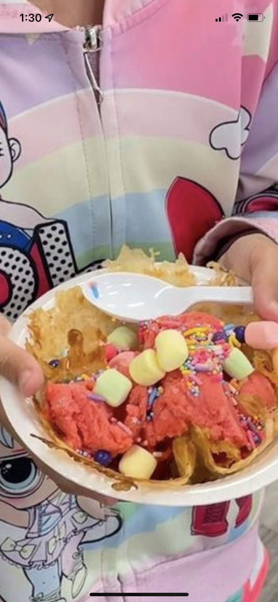 Ā Ā Ā Read moreWe were so excited to go after continuously seeing all the advertising on FB⦠everything we wanted, we were told was not available?ā¹ļø no cotton candy, cake milkshakes (like advertised) or the bubble waffle sundaes. Everything we drove there for! My niece ordered a waffle cone and it was so watery it came out thin and rubbery (as seen in the photo) so bad the rest of us ordered either a plastic cup or regular cones. I never tasted or saw such a sad waffle cone in my life š¤£š³! The young girl who helped us was SUPER sweet & tried her best but obviously needed help or additional training. The other young girl who was on shift did not help her, even when she asked for help. She eventually helped her with another customer but after like 30 mins (still helping us) and the other customer was waiting⦠we also were told we couldnāt eat inside so we had to sit outside in the cold which also additionally frustrated me. Had I known it was going to be this bad I wouldāve went to something closer to my home. The ice cream in itself tasted good but the experience was poor and we were sadly disappointed we didnāt get any of the cool things we seen in advertisements or on their menu. For a basic cone and ice cream I wouldāve went to kilwins in traditions⦠or something...
