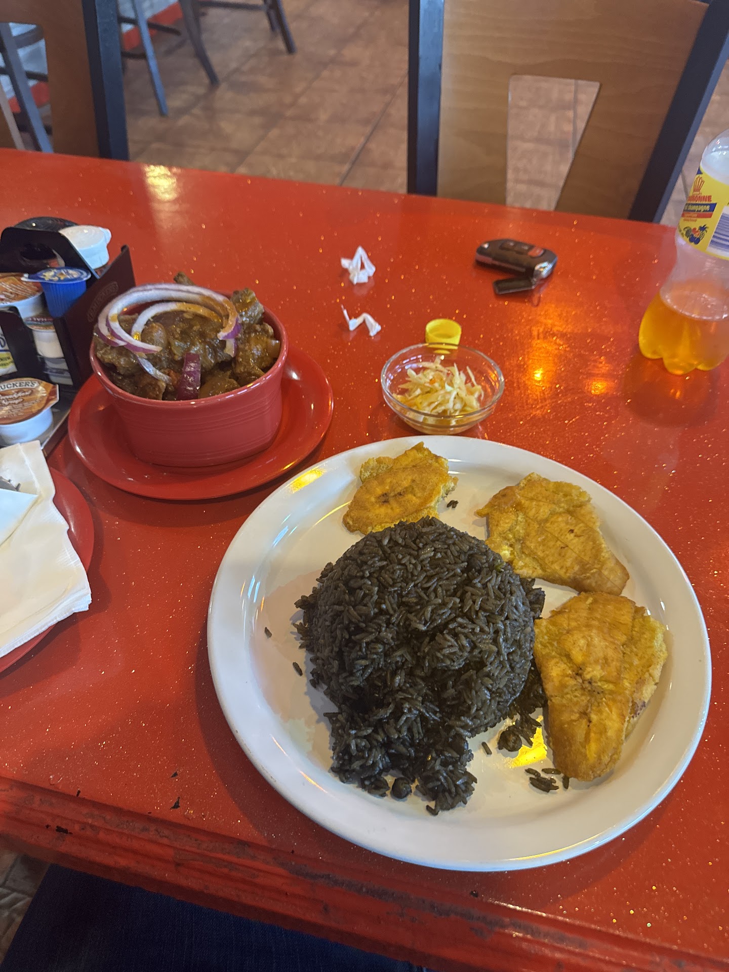I ordered the (specialty) stewed turkey with Caribbean rice and beans, fried plantains, and Haitian pikliz. The turkey was clearly slow cooked and absolutely delicious. And virtually no salt for those watching this. I have never had pikliz. It is essentially cole slaw with spicy Haitian pepper. The pepper was a real treat - I am a big hot pepper fan but have not tasted anything like this. It has heat (I would say medium hot) with a very interesting spicy flavor. Nothing like the traditional jalapeno, cayenne, or habanero.