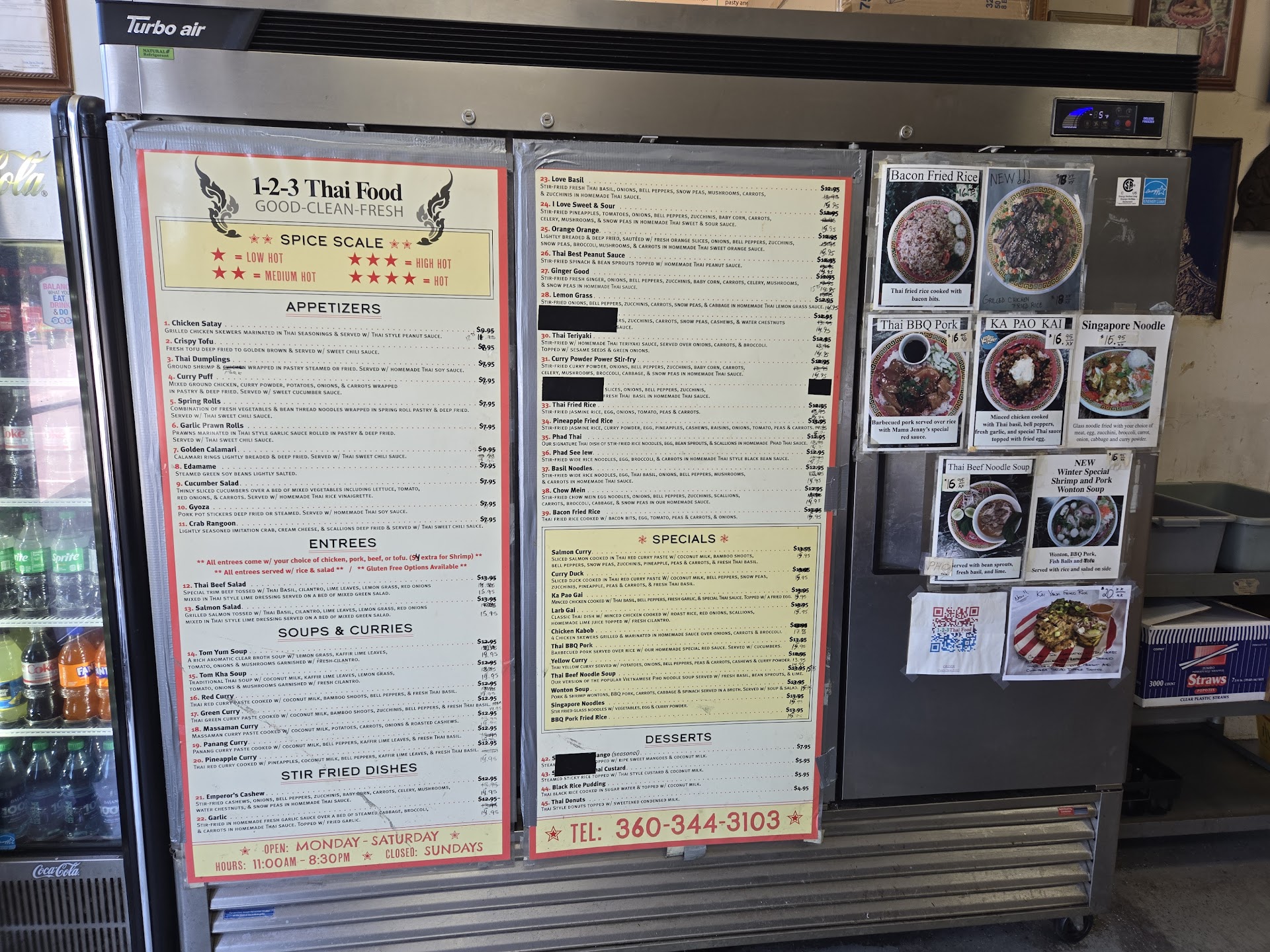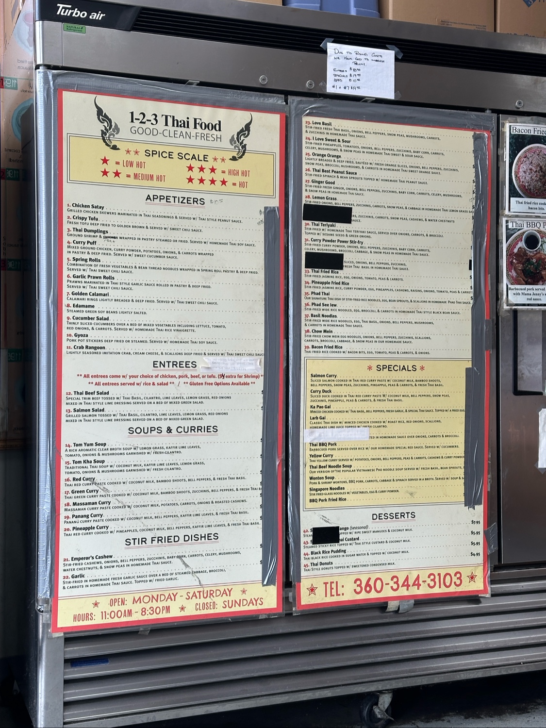 1-2-3 Thai Food is my latest 5-star recipient. It's highly unassuming from the outside and inside With only a few tables for customers who choose eat in, it's focus is on takeout (with its huge open kitchen and it appears to do it exceptionally well. My wife and I chose to eat here because of the uniformly high Yelp ratings. We were greeted by a very friendly man who patiently waited to take our orders and also explained more about some of the dishes. Yelper tip: If you order Thai Iced Tea, make sure you specify THAI ICED TEA. We just asked for iced tea and that's what we got--iced tea with ice cubes in a glass. We just went with the flow, vowing to order more clearly next time.