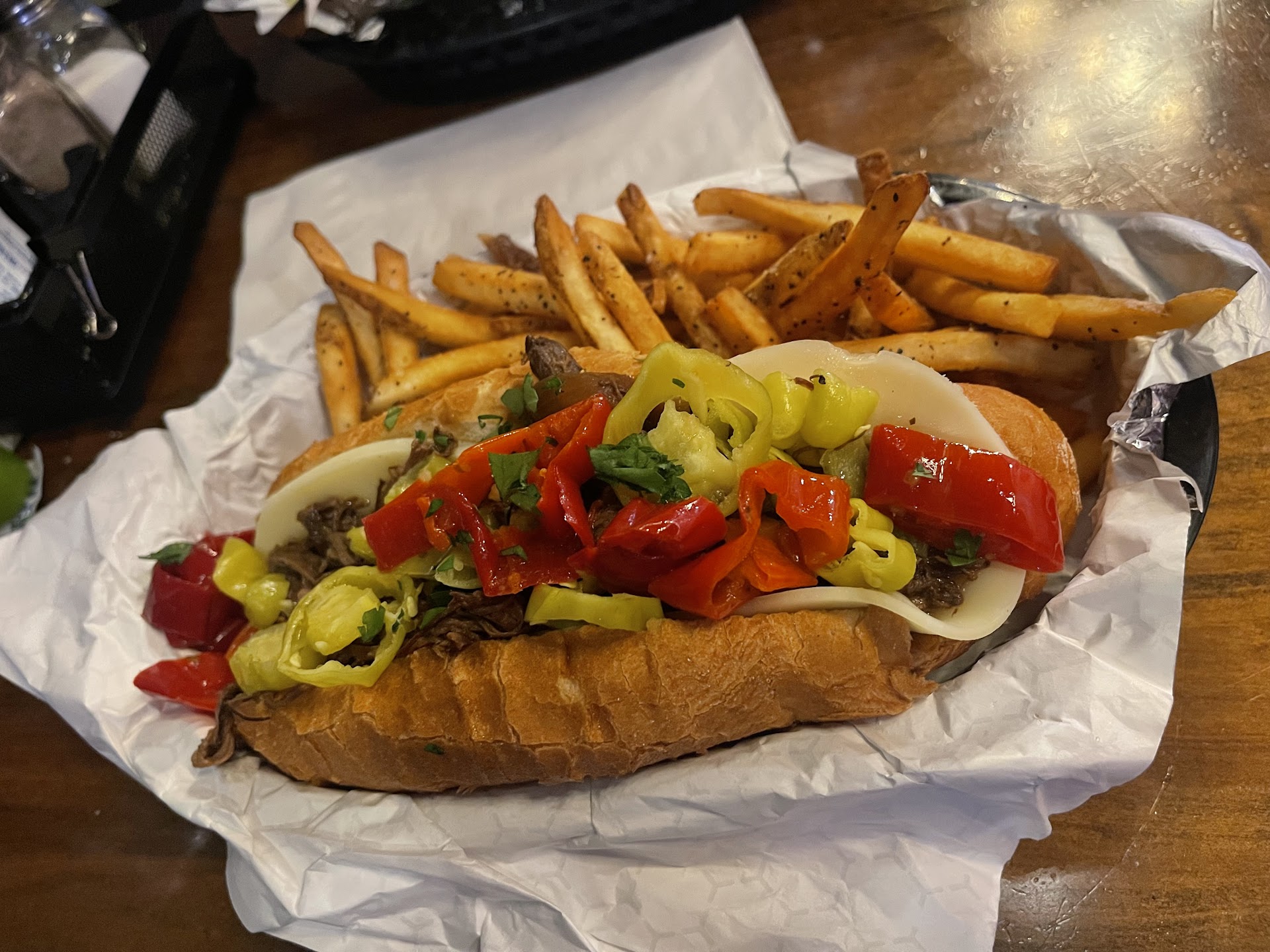 Read moreThis a cool little tavern at the far end of Water, glad my motorcycle-weary legs needed a walk or I may have settled on pizza. While 2 gents played folk tunes on strings up front I sat back near the bar and ordered the Uncle Geno's pepperoni beef sandwich- SO SO BOMB!! Toasted french roll w a generous pile of spicy tomatoey shredded beef, sauteed sweet peppers (and I think some sauteed shrooms in there too) with crispy fries and 2 pints of PNW ale, totaled around $35. I sauntered back to my hotel fat and sleepy.