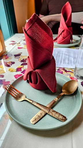 The restaurant was nearly empty when we arrived at about 4:30. It is nicely decorated and the place settings were pretty. We were shown right to our table and provided with big glasses of water.