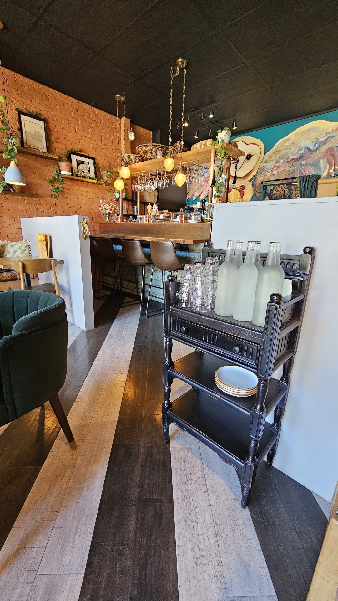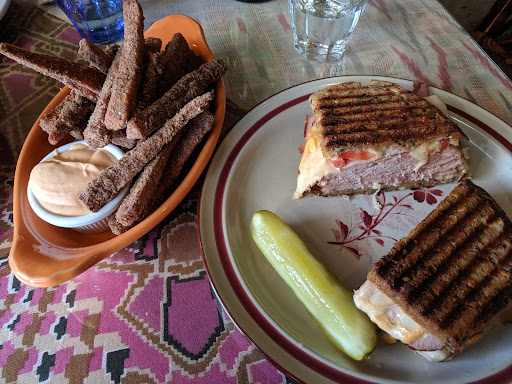 So we stopped in hear for an early dinner and I was very impressed. I should have taken photos of the inside because when we got there almost no one was there by the time we finished there were no empty tables. So what you really want to know about is the food. In my picture here is an order of sweet potato Fry's on the left and their spicy ham and cheese sandwich. The Fry's have a lovely spicy mayo dip and unlike most sweet potato fries are breaded. The sweet smell of the fries with the spicy mayo was a great combination. Now for the main course. This sandwich surprised me. To start my wife picked this place specifically because that had a vegetarian Berger and the large number of vegetarian and vegan food options didn't leave me super hopeful for the ham sandwich. However I really enjoyed the sandwich the ham that they used was a nice thick cut from good ham not your standard deli ham. This ham just easily pulled apart and tasted great with the cheese and the light spice of the sauce. They only downside of this is the bread ended up a little to crisp from the cooking process for my taste but still it was great and I was totally full after.