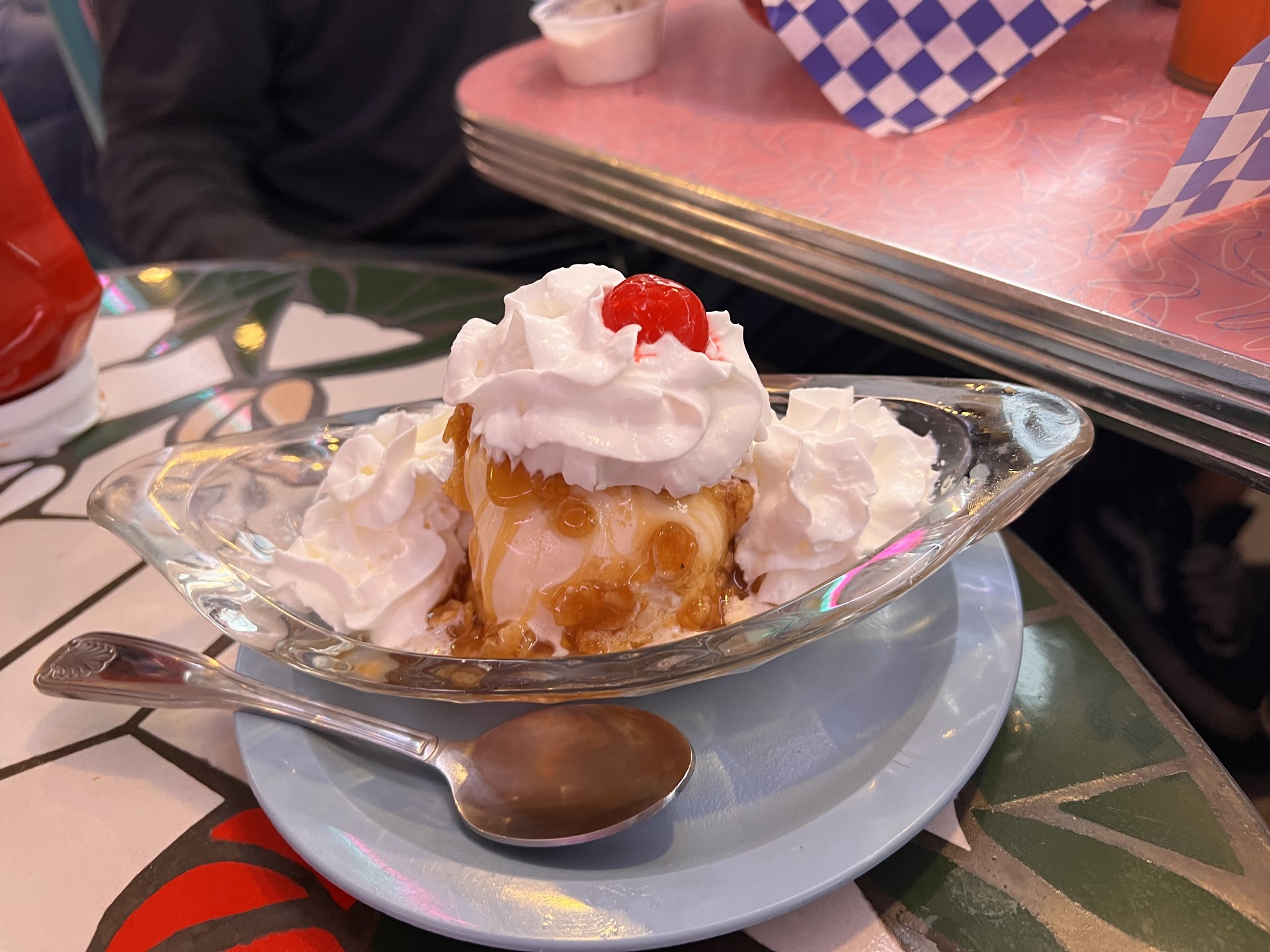 Read moreThis place hit ALL THE WRONG marks for me. For one this is a 50's American diner that should pride itself on a fun family vibe and experience. The older owner guy walks around acting like he hates America and its music and food. I have went three times with my family and every time the same SUPER down vibe. Secondly everything in the place is "decor" it's not functioning or real or exciting. Three the food is not only bad and cheap frozen food the menu which is very simple lies and lies. I ordered a kids tenders once and then I ordered the adult tenders another time and the adult tenders had LESS chicken than the kids one haha. I asked the same older owner guy who looks like he hates life and he said yes this is adults. $14 for 2 and a half piece of frozen tenders. Fries were extra HAHA. This diner is THE WORST AMERICAN DINER I have ever seen. It is everything wrong with a diner. A Bored lack luster and downright sad staff, food that you can get in any high school cafeteria and high prices and just anyway they can possible ream you is employed. They even charge you for drink refills for standard fountain drinks. I SURE wish someone who actually loved America and its music and culture from back then would buy this place and make it nice. I will never go back. And all THREE of my visits were spread over years....