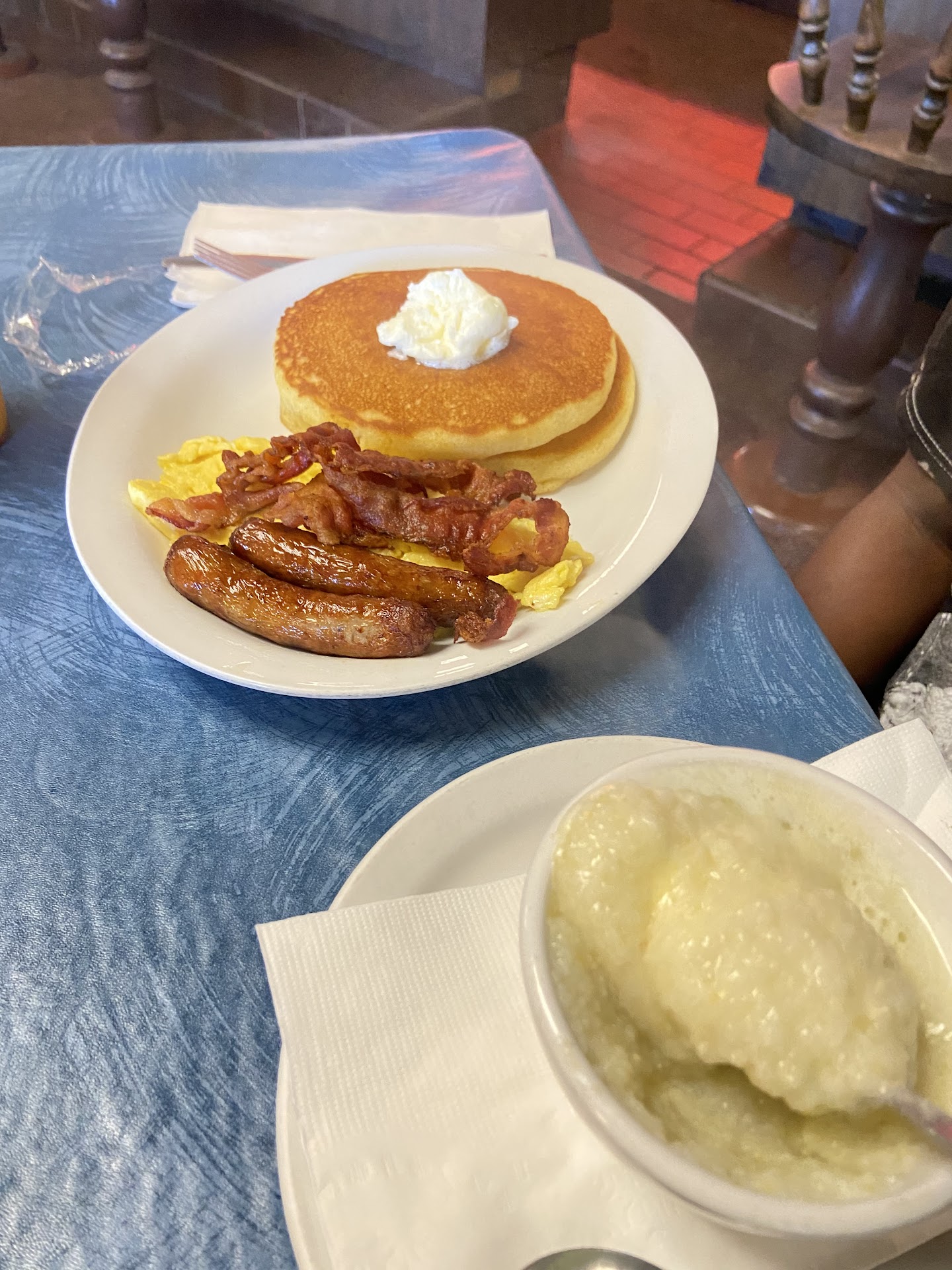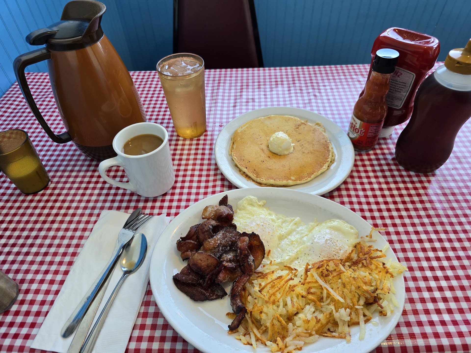 Read moreHave been here before but not for some time maybe even before 2020. I ordered the Eggs Benedict after asking the server if she would recommend it. I'm always skeptical about this dish at restaurants because a lot of cooks don't do it justice. After she said it was a very popular item on the menu I decided to give it a try. We then waited a very long time for our food. When I got my food the poached eggs were hard absolutely no yolks. What Eggs Benedict doesn't have yolks it's 1 of the things that make the dish?. So I called the server back to our table and told her the eggs were hard and way over cooked she looked at me like I had lost my mind got a attitude and asked if I wanted new eggs. I said yes if it's not to much trouble thank you. Trying to be polite and still getting attitude. After about 3 minutes or so she came back with my plate that now had a huge pile of hollandaise sauce on it like 5 cups just insane with 2 fried eggs instead of poached eggs on them. Yes I got yolks but it was not poached eggs and the amount of hollandaise .... crazying and I love a good hollandaise which was not great really lemony. Disappointed and I could only eat 1 with about 2/3 of the hollandaise sauce wiped away. I will say the 5 silver dollar pancakes we got from the kids meal was nice and like 3 times the size we were expecting my granddaughter was only able to eat 1. That was...