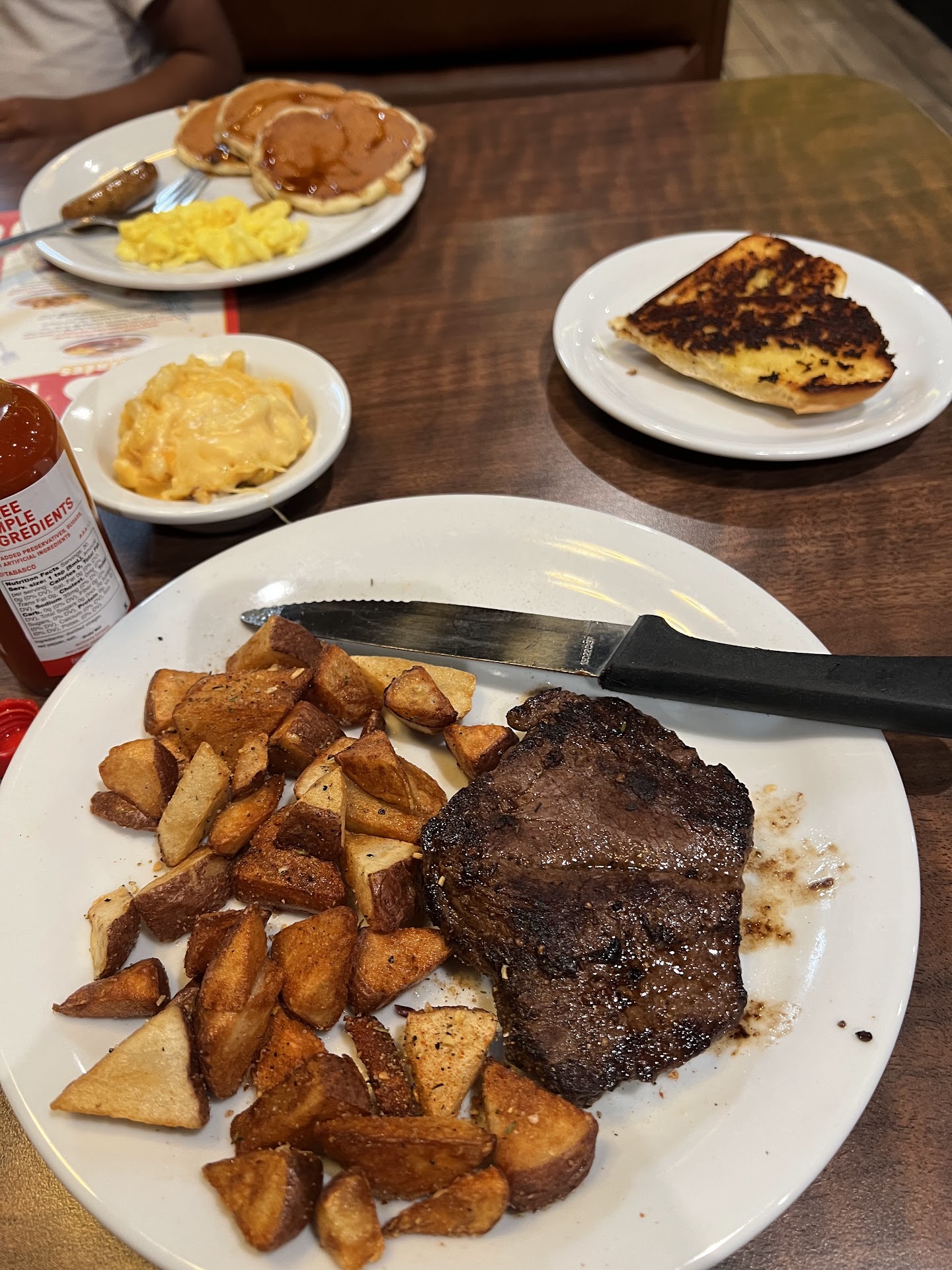 She brought my plate out but never brought my wife's plate. I was halfway through eating my food before my wife flagged another waitress who apologized and brought my wife's plate. My wife never received her pancakes. My food although was brought first, it was room temperature. My steak was over seasoned and tough. Our waitress never came back to see if we needed anything, ever. Other staff informed her that we were waiting for the to-go box and the check, it took her 3 trips to bring us the check and 2 boxes. The cashier fully aware we were dissatisfied with the service did not asked "how was your meal?".