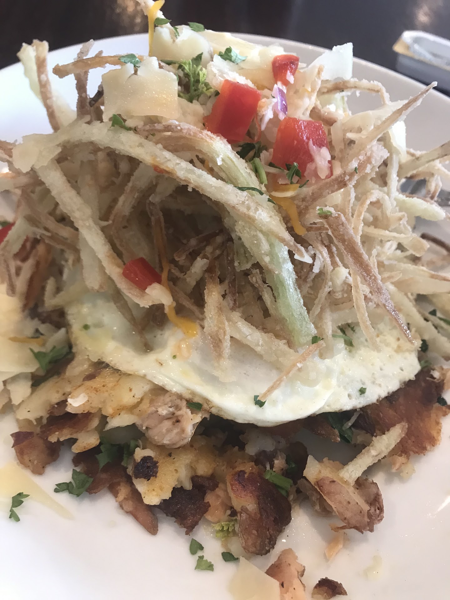 I had the pleasure of dining here earlier today with a gift card I got in a raffle put on by local farmers, Jackie and Zach of Zazu Mushrooms, and greatly enjoyed the experience. The hostess seemed stressed and seated several parties who’d entered after me first, but I did arrive right at the beginning of a bit of a rush, went to the bar to order a drink, and stood over to the left of the entrance as to stay out of the way of others coming in and ended up behind a few people. No qualms, there was a steady stream of people incoming and I’d have lost track of me too if I were in her shoes. As a previous barista, I appreciated Gracie’s willingness to make me a café miel (also appreciated having oat milk as a non-dairy option) although she never had before. She balanced tending the bar and waiting tables with grace (pun intended). As a cook, the smoked salmon bowl exceeded the high expectations I had while browsing this unique menu online. I’ll be dreaming of those crispy leeks for weeks (finances allowing, less that that). My over easy eggs were done perfectly and the potatoes had a crisp on the outside, creamy on the inside that I will strive for in my own cooking eternally. The salmon had a more forward fish taste and less of a smoked flavor than anticipated in smoked salmon but it was my first time eating fish in quite some time. The music was tasteful, although I did put in headphones to tune out other patrons’ conversations while reading. Overall, a very pleasant experience and I look forward to trying more of these...