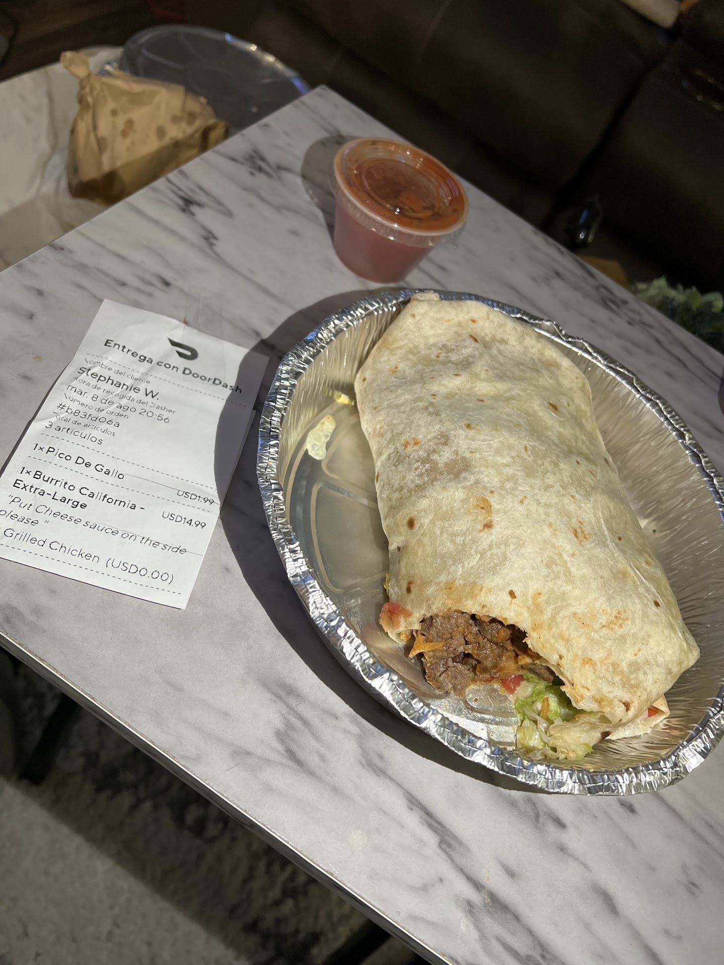 Read moreDon’t ever order from this place! Terrible service. Ordered a grilled chicken California burrito with the cheese on the side and received a steak burrito, no cheese, and a side of salsa. Called and complained and was met with someone telling me that I need to take it up with doordash and it’s not their problem. I explained to them that it’s not door dash that messed up my order, I asked to talk to a manager and then I was being hung up on. After 5 mins of calling back and getting a “disconnected number” it went through and I spoke to a different gentleman and he said that doordash should have to fix it lol.. doordash offered me $4.17 back for a $15.00 burrito that I can’t eat.. I explained that I couldn’t eat the burrito they sent and $4.17 from doordash wouldn’t suffice. that worker ended up hanging up on me also. Ridiculous service,...