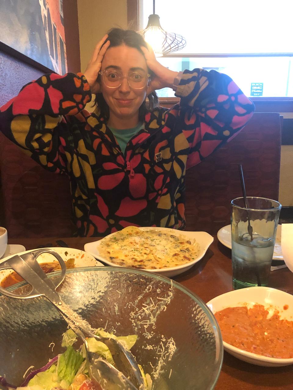 As always, we ordered the unlimited dipping sauce trio-- we recommend this to all. I’d like to fill up my bathtub with that four-cheese marinara. Our server assuaged any anxiety by letting us know that he would be happy to bring out TWENTY bowls of sauce, if we saw fit. He just gets it. The soup, salad, and breadsticks were all up to OG’s top-notch standards. When the server got out the cheese shredder, made eye contact with me, and said “tell me when,” I didn’t feel so alone anymore. This happened again and again, and is the sort of thing that keeps me coming back for more.