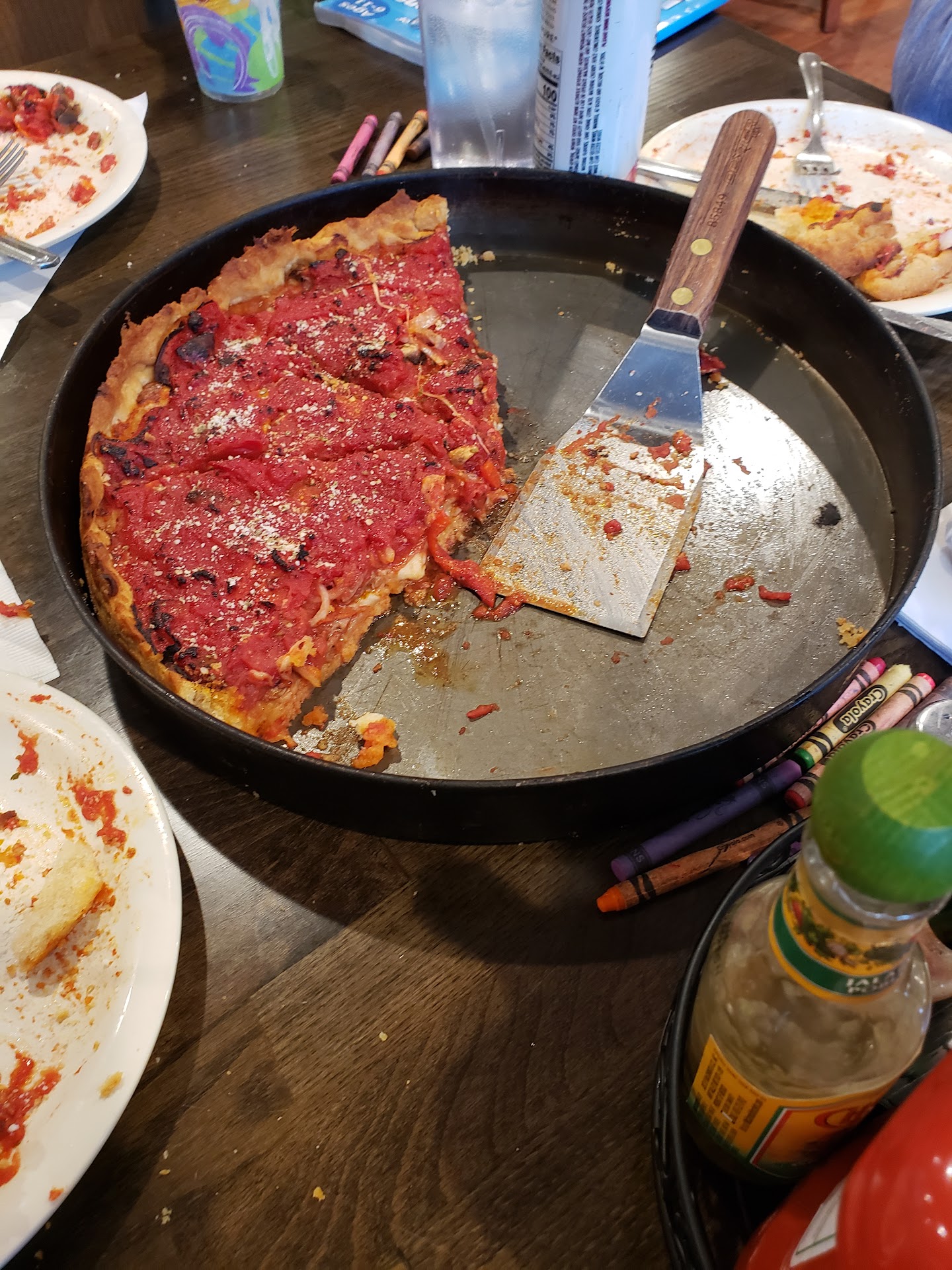 The deep dishes were exactly what you'd expect from Uno's downtown Chicago. Was very happy that the sausage was made into a patty for the entire pie and not just crumbled like most other places try to slip past you as a Chicago deep dish. The sauce on top was again perfect and exactly what you'd receive downtown.