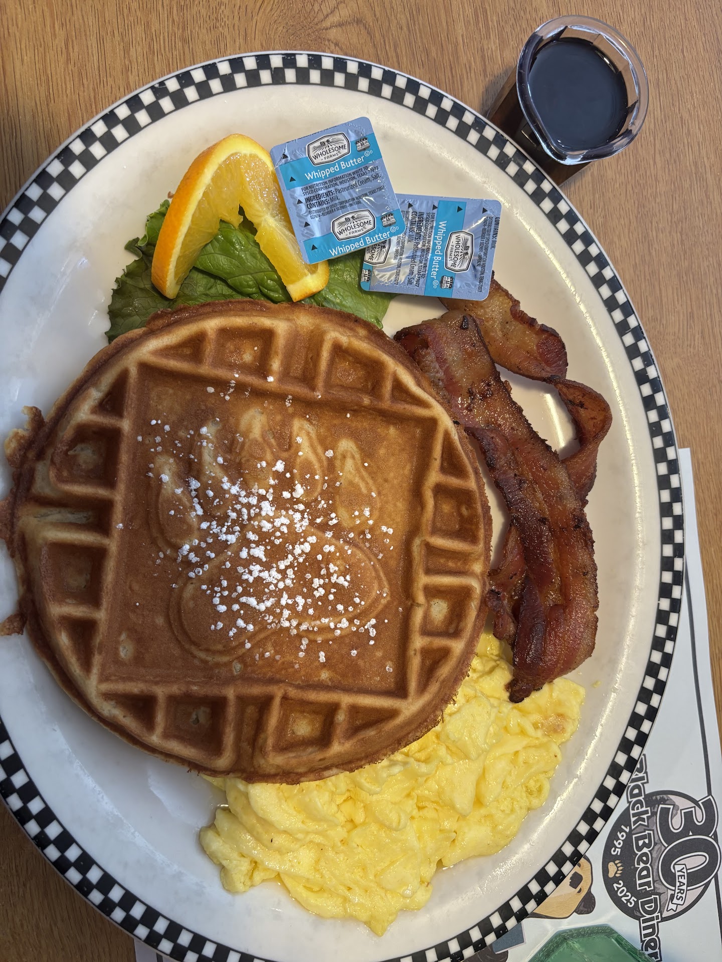 The main dining area had booth seating with some counter seating. I suppose there was table seating but I didn't see any in the main area. I ordered the customized breakfast of a waffle, bacon, and scrambled eggs. The waffle smelled like vanilla. It's a biggum... pretty large size. It has the signature bear claw waffle print which I adore. It could have been a bit crispier still delicious though. The syrup is maple syrup, so no High Fructose Corn Syrup (HFCS). The waffle mix also doesn't contain HFCS. Even the ketchup they serve is free of HFCS. So appreciate that. The bacon was thick cut and cooked perfectly, the two entire pieces were cooked evenly to a perfect crispy doneness. Not an easy feat. Our waitress was great. Big smile and welcoming attitude.