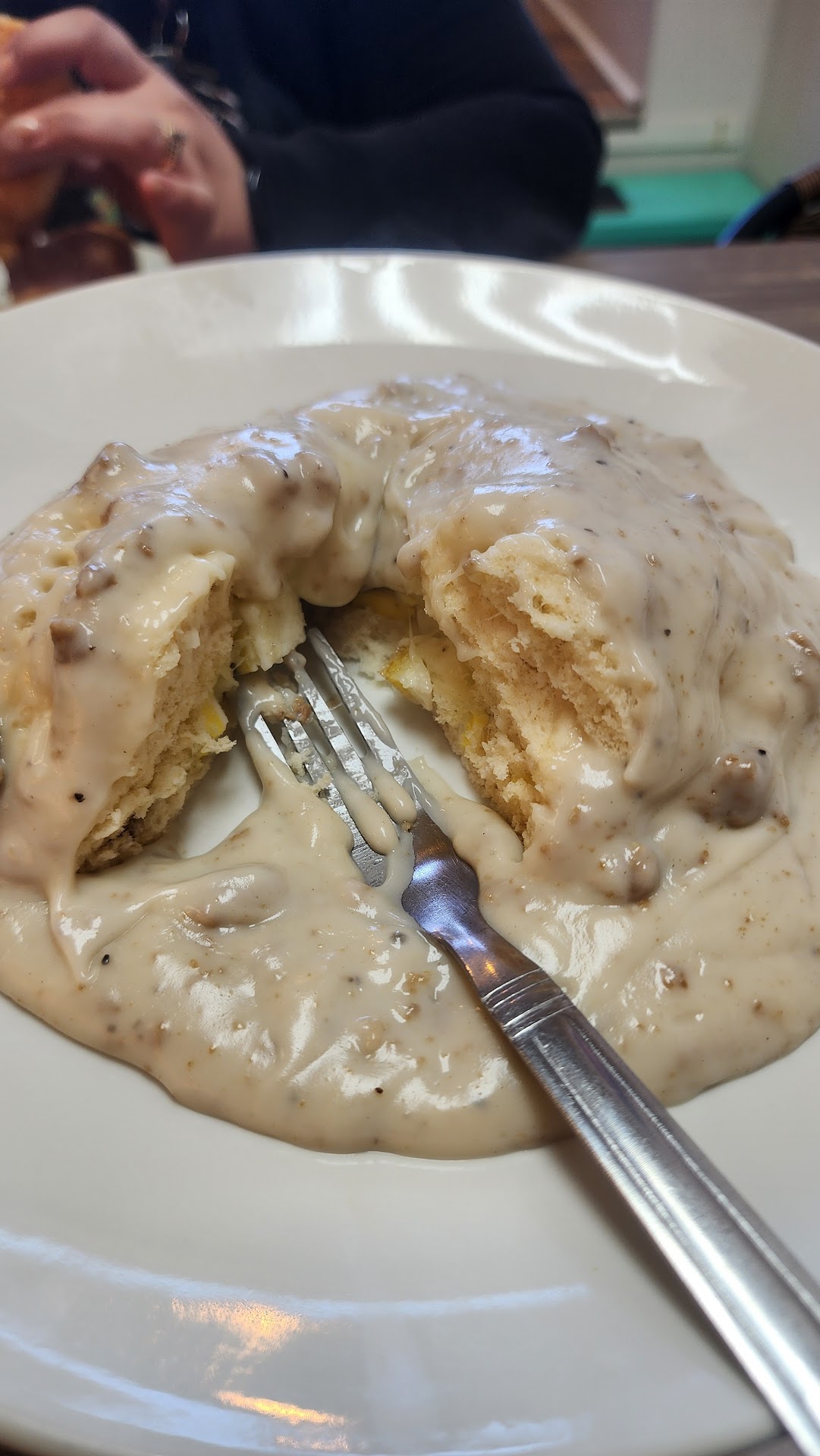 Next, we tried the stuffed biscuits and gravy, which did not disappoint! The biscuits were tender and packed with flavor, and the gravy was savory with a perfect, hearty texture. It was comfort food at its finest! This was complemented nicely by a breakfast tea, which was fresh and soothing.