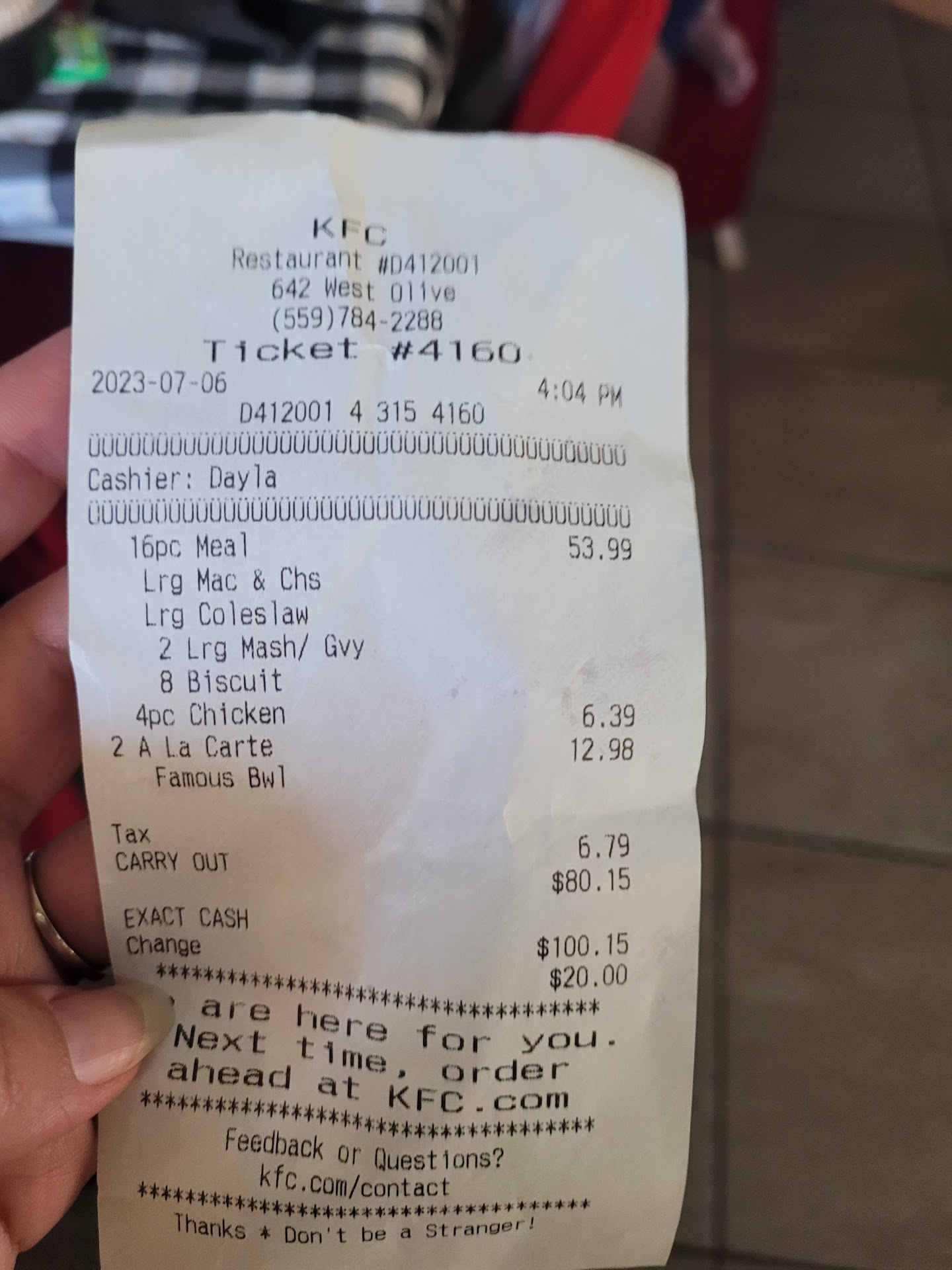Read moreQuality has really gone down hill at our local KFC. Seems as though I've been left disappointed after every visit for the last year or two. The only thing left that was consistently good was the fries and after this last visit I can no longer look forward to those either. Once if finally got my fries (after they were not included in the bag initially or after the second time returning to the counter to remind the worker that we were still waiting for them) they were cold and stale tasting. Very disappointing. I had hoped that they would be fresh at least since we had to wait so long. I can say this though, in an attempt to make up for the repeat forgetfulness they gave us a large order of stale cold fries instead of the regular one provided with the meal. So bonus points for...