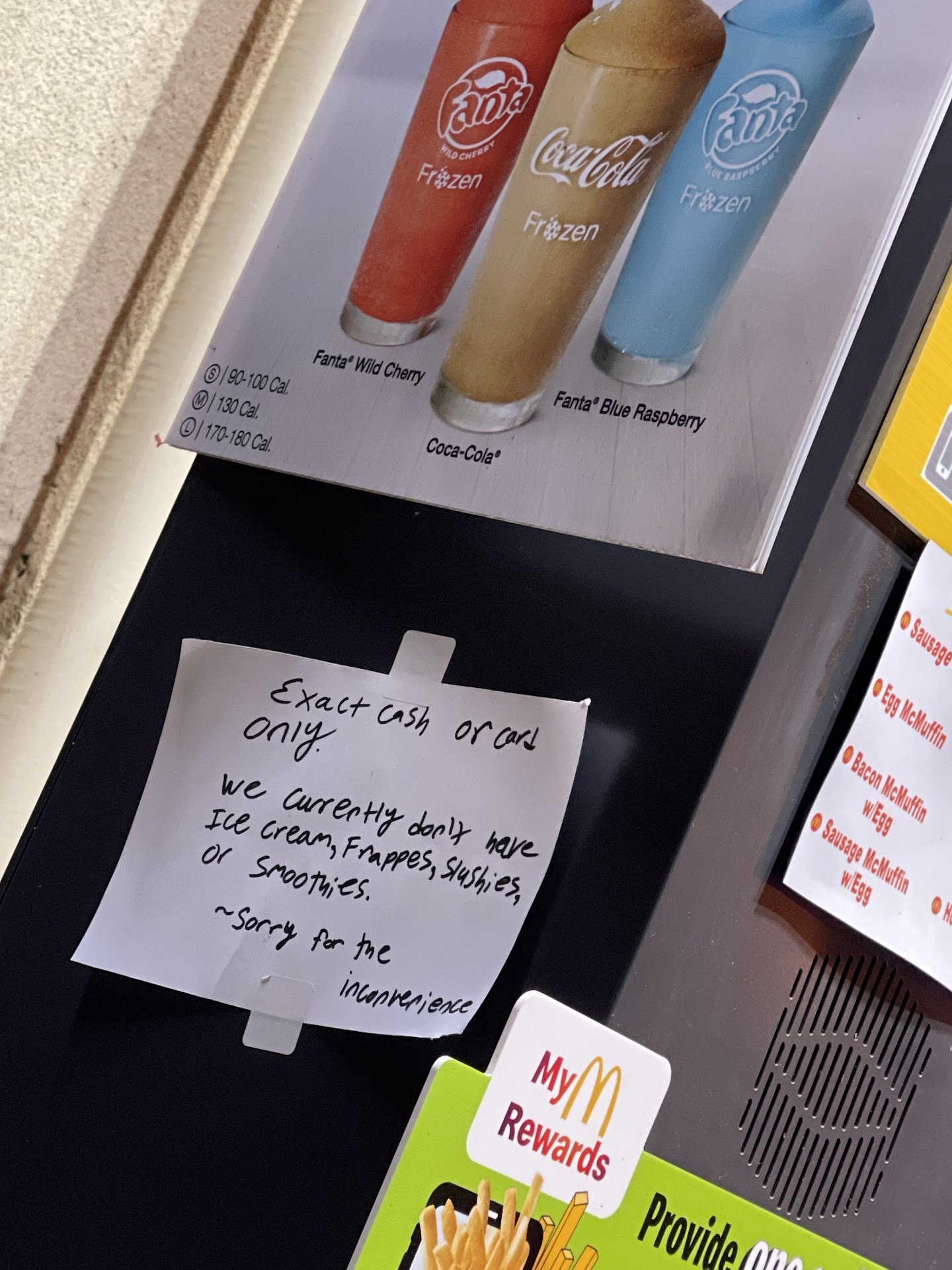 Read morePretty Disappointing... Its been years since ive been in Porterville. And coming here to this McDonald's today, i realized this place hasnt changed a bit! Its still full of employees that dont look happy to be here at all. The credit card machines are down and apparently have been for a while so they were taking cash only. The cashier was complaining about not having any change. Nickels and pennies only! Said someone forgot to do a change order. Back at the fries there were 2 employees standing there gossiping about other customers. And giving coworkers dirty looks. Like i said, this mcdonalds has never changed. 10 years ago it was just like this. They dont greet their customers. No smiles. Just rude behavior and dirty looks. Yup. If i ever go to mcdonalds it will be on the Other end of town! You would think by now something would be done about this place. Look at all the reciews....