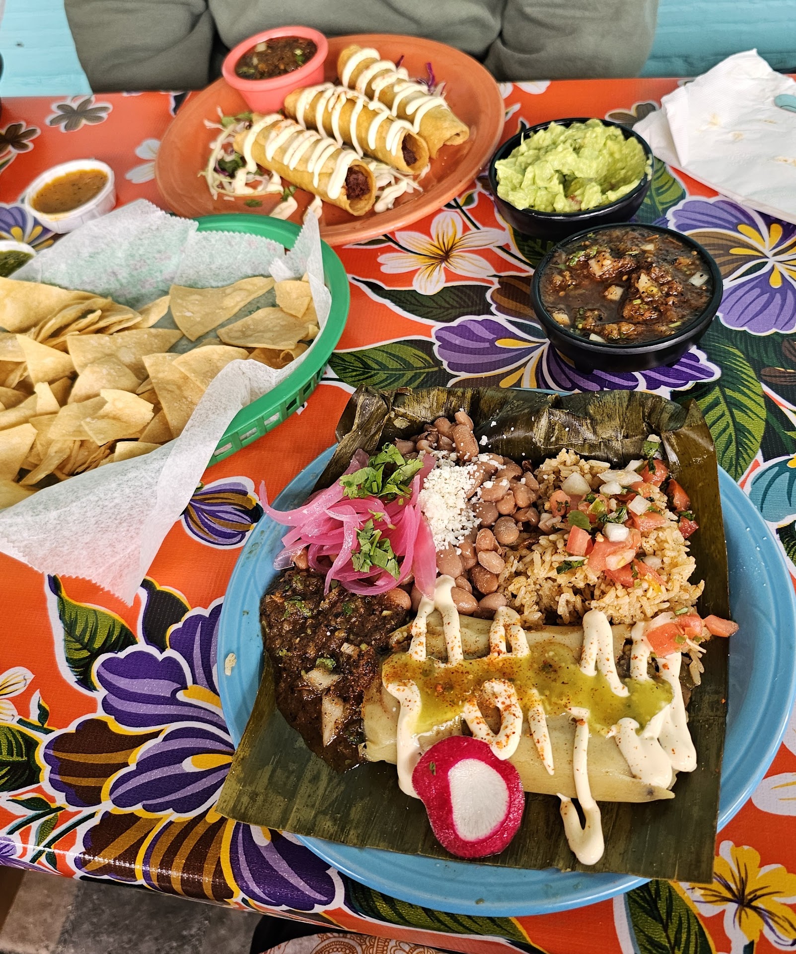 Previously: Sat in the 'new' room at the side of the restaurant. Picnic tables with lots of room to stretch out. Bright floral vinyl table cloths. Alanis Morrisette soundtrack at good volume. Good acoustics out here—low chatter. My go-to: Tamale plate with one veggie tamale plus a Migration IPA. Excellent service.