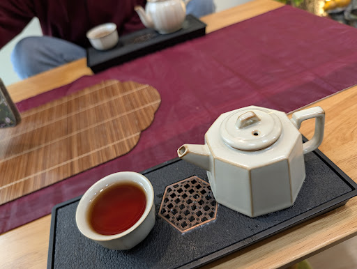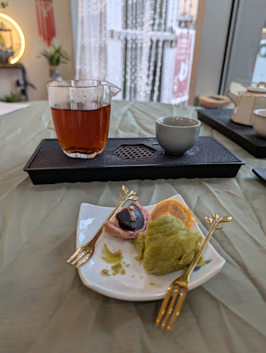 Such a delightful find— warm, serene, and beautifully decorated. The space is thoughtfully designed, with calming waterfall features, traditional Chinese artwork, and cozy tatami seating. Tea menu offers variety of options and several top-quality selections truly stand out. Elegant tea tables, along with the exquisite teaware and cups create a harmonious tea experience. The steamed dumplings are delicious with their special spicy sauce. Xin is kind and attentive, adding a personal touch to the visit. It’s such a relaxing place and you could easily spend hours here....