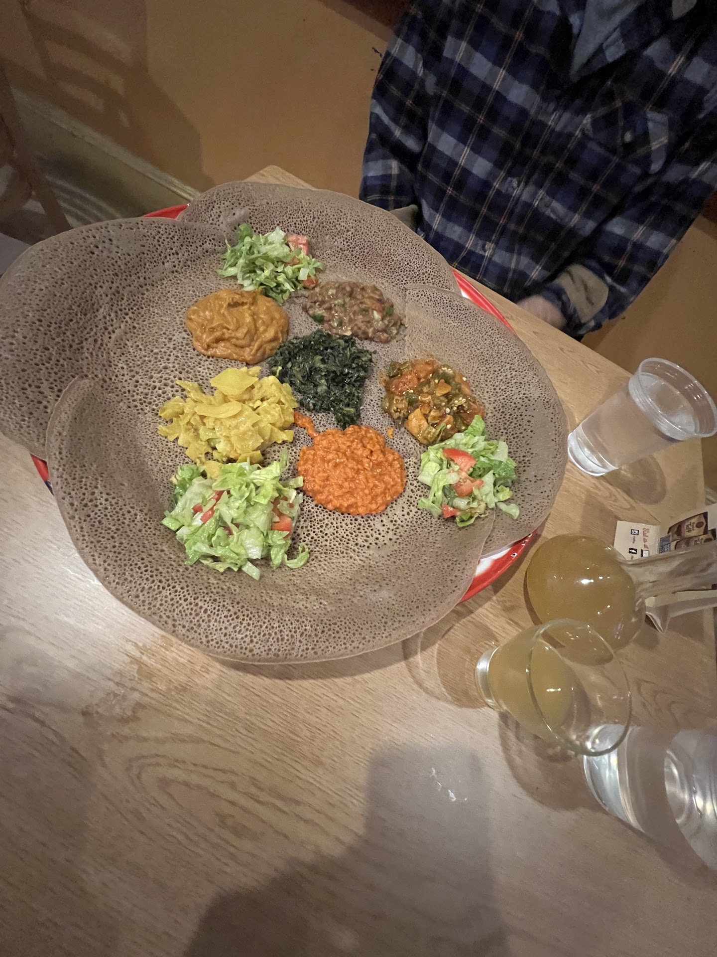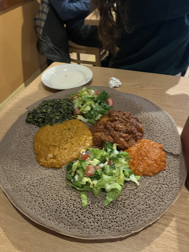 Read moreI visited before Covid and remember it being good, but underwhelmed by the size of the dish and injera given. Came here for date night before a show the other night. The atmosphere is casual with nice cultural art. The two of us shared the vegetarian sampler, a $70 platter, that is advertised to feed 3-4 people, thinking we’d have some leftovers for later. The dishes were very tasty and the honey wine was alright. The biggest downside was that we polished off that platter in a matter of minutes. The portions were definitely not going to feed 3-4 people. Maybe 3-4 children. A bit disappointed that we paid so much money for such a small portion, it makes we wonder if they altered the portion size because there was only two of us? I don’t know, but maybe ordering a couple of entrees instead of the sampler would’ve been better, though I’m not convinced it would’ve been any better of a portion size. Again, the service was good, the food was good, it just left us...