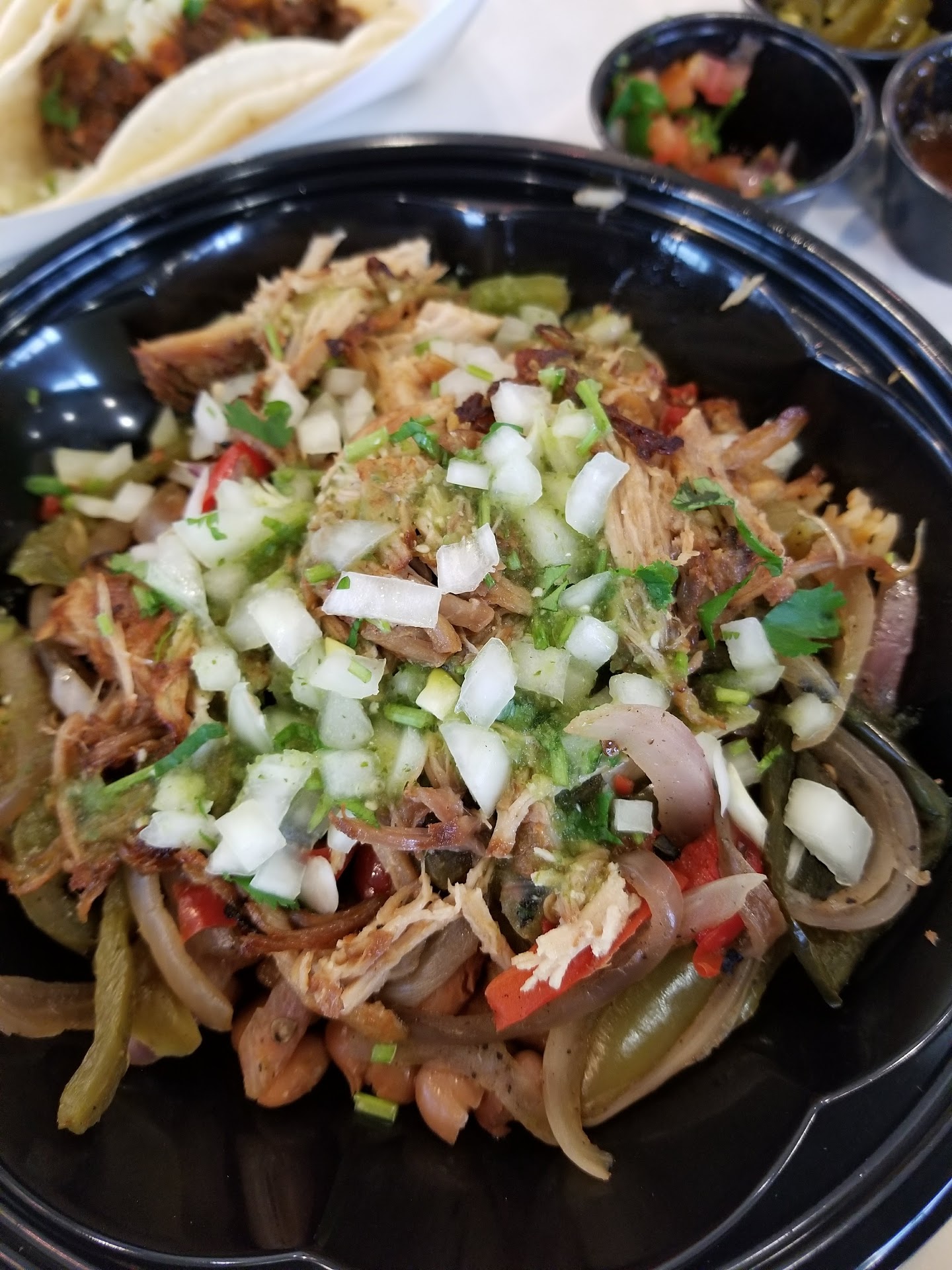 I ordered a Tostada salad and my wife got their Baja Ensalada. We both had chicken. Immediately, we were surprised with as many different ingredients in each dish, how could it be completely flavorless? The lettuce had unchopped stalk ends, the chicken tasted like char, the pico de gallo was mushy and the guacamole was brown.