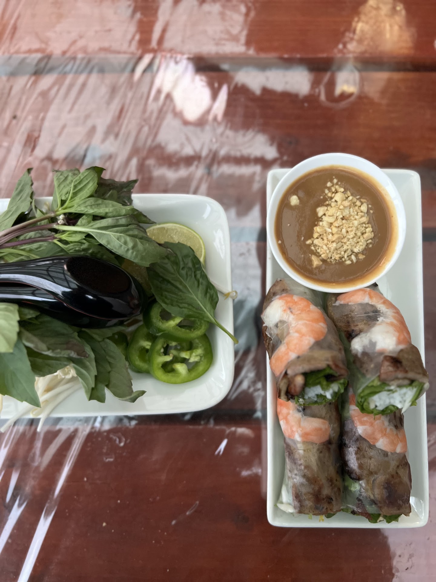 The fresh rolls were very long and skinny, so long they had to be bent to fit in the box. While the presentation was lacking, they were fresh and tasty. The peanut sauce was extremely mehh. The cost of the rolls also doesnt change from shrimp, to pork and shrimp to just tofu. The fact that they charge the same for tofu that they do shimp and pork is unethical-thats ridiculous pdx garbage. There are few veggie options.