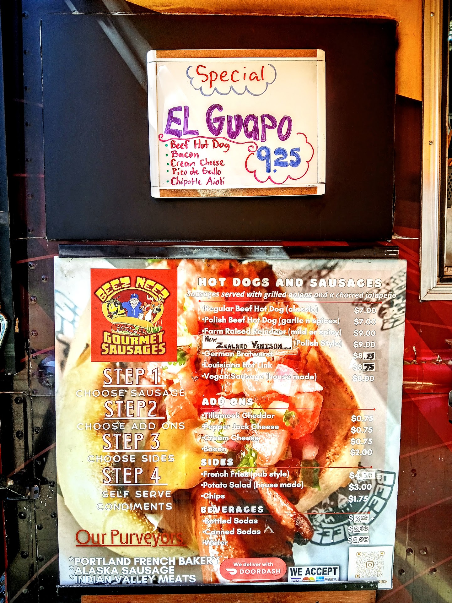 Cleanliness: 4 (It is a food cart, but the viewable cooking facility appeared well kept). Menu: 5 (If you are a manly man, and you enjoy delicious hearty dogs, look know further. In house recipes are to die for.)
