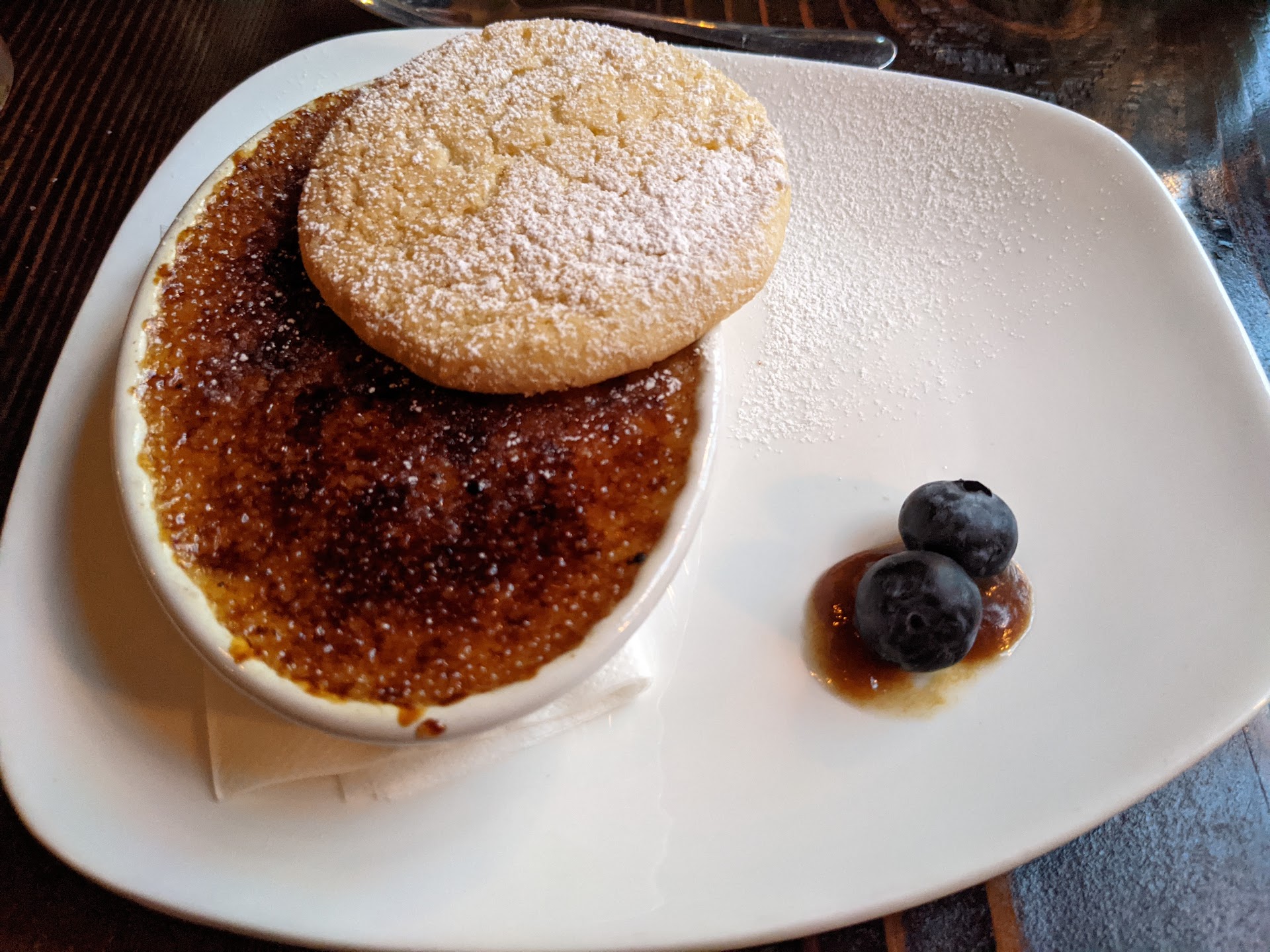 Amuse bouche was a lovely slightly spicy tapenade on a 'house-made' corn chip. We shared a delicious pate plate. I ordered the roasted duck; crispy skin and moist succulent duck, served with roasted green beans in a minty sauce. My spouse enjoyed the lamb and I can attest that it was tasty although a bit fatty. I liked the toothy farro served with the lamb; there was a bit of sauce including some bacon mixed in.