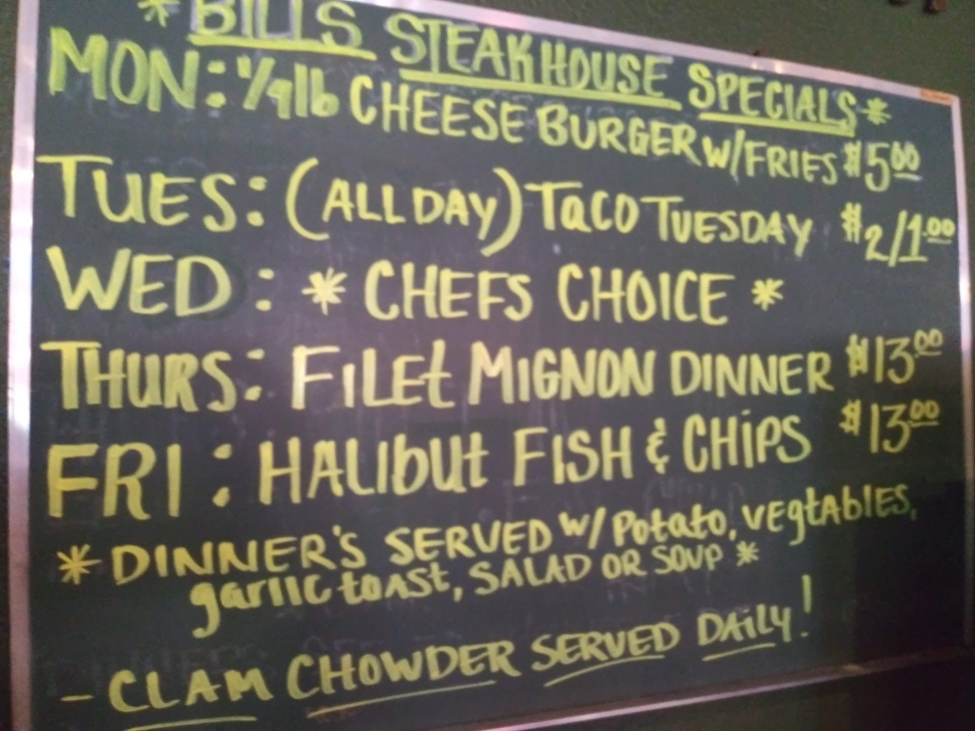 Read moreI ate at Bill's a couple times several years ago & was very pleased with a good quality steak at a reasonable price. Sadly, it isn't the way it used to be. Tonight's supper cost 30% more that it used to and the quality was terrible. My NY strip was full of gristle and I seriously doubt that it even came close to the advertised 12 oz. It was both smaller and much thinner than when I made the same order on previous visits. On top of that, the veg was cooked to mush and the baked potato must have been keeping warm in the oven ever since lunch time.