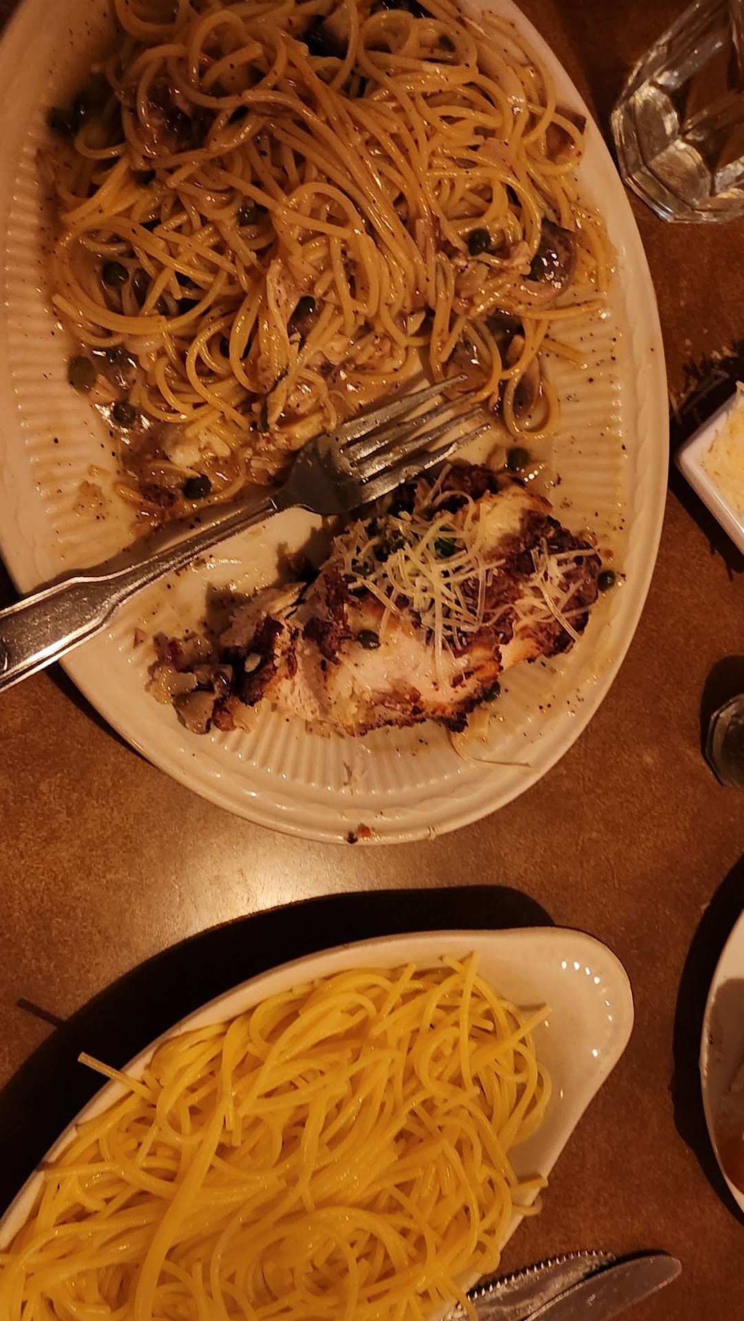 The entees: the alfredo was thick and delicious needing just a little table salt and pepper to be perfect. The chicken sliced on top of the Alfredo was crispy and seasoned on the outside and wonderfully juicy inside. The chicken parmesan was memorable. The chicken breast was big enough for two and pleasantly paired with a traditional spaghetti and red sauce.