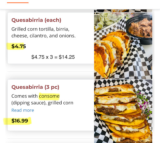 I ordered through the online ordering site that they have linked via their website. I ordered 2 orders of 3 quesabirria tacos that includes consome that totals to $16.99 each. A single quesabirria costs $4.75. That is the total both in person and online. When you multiply $4.75 by 3 you get $14.25. So tell me why when i went back to get my consome that i thought they forgot, they tell me that the 3 quesabirria order doesn’t come with consome and that the extra charge is for the little sauces? Okay so why is it $16.99 online? They they told me that the online systems charges you for the convenience which is correct but it is a separate charge that is added on top of the charges. Not an extra $2.74 for only that one item on the menu. I tried to tell them that it should get fixed if they don’t want to do the “deal” that is clearly listed on the order site.. If you want to come in person and try their tacos I say go for it. They are fantastic but their ordering site will screw you out of your money. Thankfully i got my consume but i was told that they won’t do it again 🙄