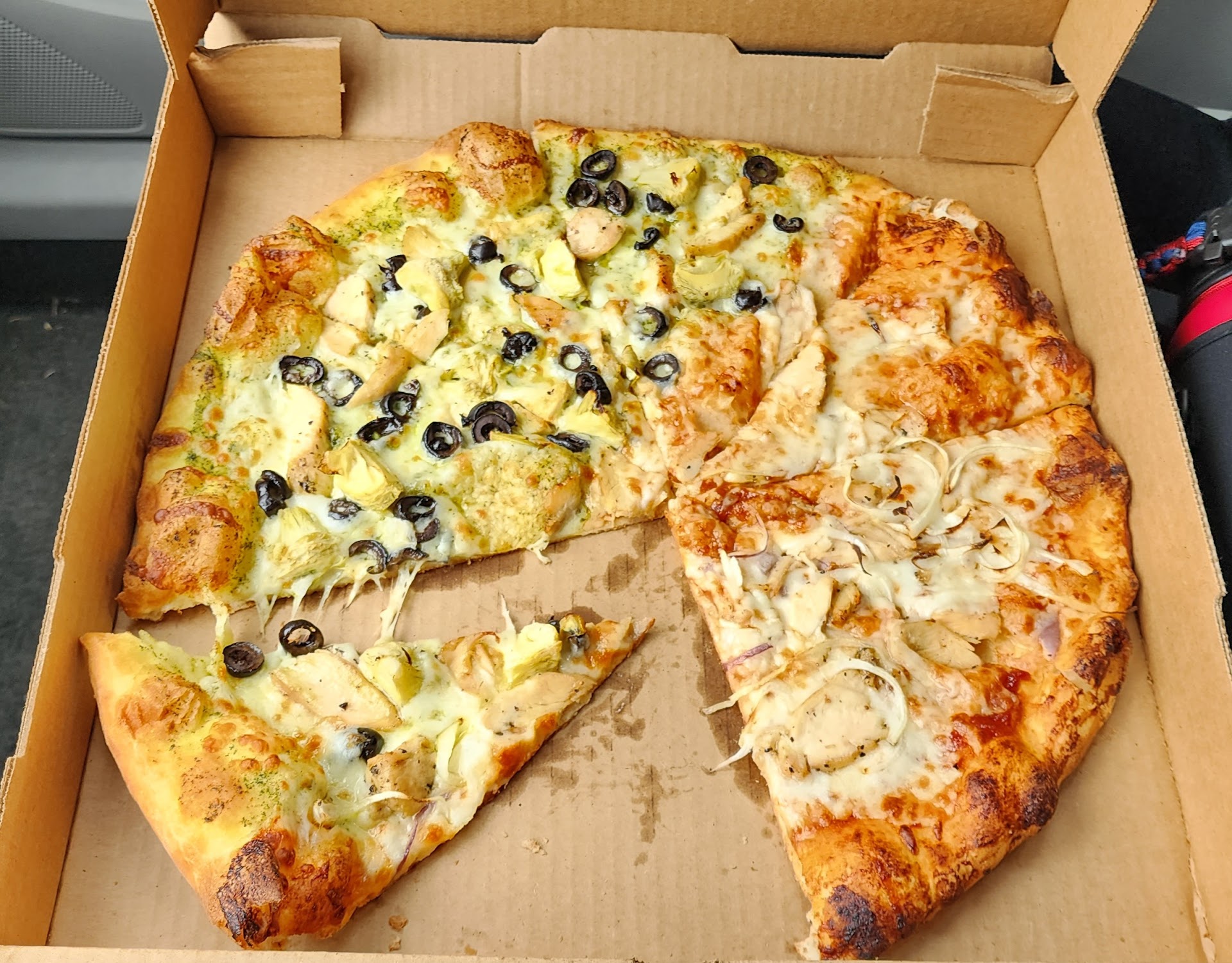 This picture, is half Pesto, and half BBQ chicken. The first pizza I got was a half Pesto, and half...