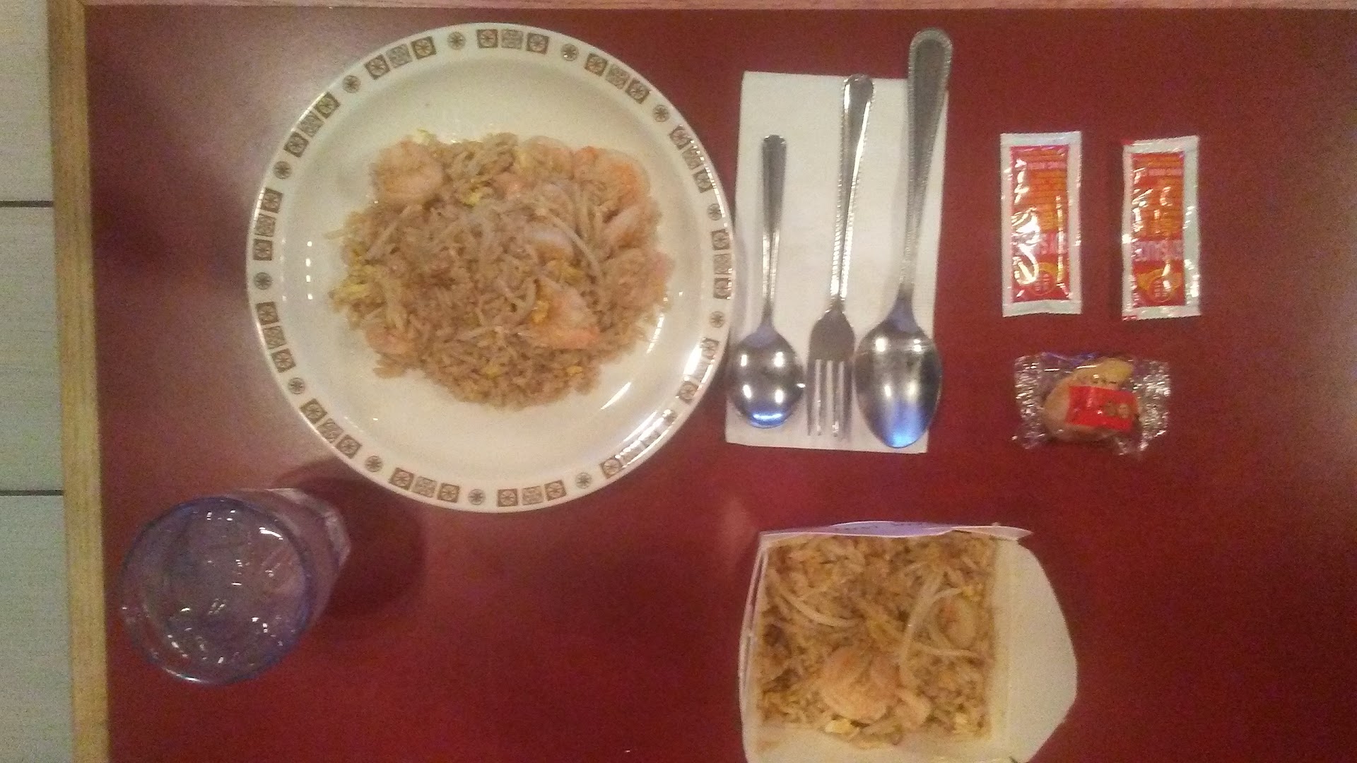 Now throw into the mix the Mom& Pop team. Working day shift. The original owners. She's out front with her friend or sister. He's in back, cooking and talking to the prep guy. Tossing a plate onto the pass-bar. More Chinese on a plate going to the folks just over there.