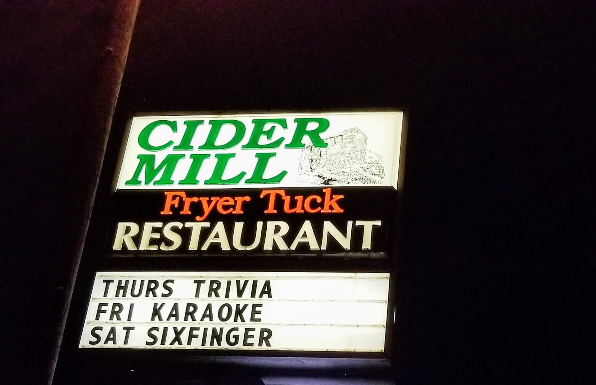 Finding it is a bit of an Oregon Trail side quest. You’ll hit a weird intersection, take a turn that feels slightly illegal, and suddenly you’re staring at two doors—one says Cider Mill, one says Fryer Tuck’s. Choose wisely, traveler. We went in through the Fryer Tuck’s side and were greeted by an interior that’s part gritty dive, part family relic, part “I bet Anthony Bourdain would have loved this joint.” The fixtures are old, the front counter is clean-ish but not gleaming, and you get the sense that the kitchen has seen a few decades of hot oil and good stories. I won’t lie, I did have a fleeting “how’s that health score looking?” moment, but the smell of fried chicken overruled my hesitation.