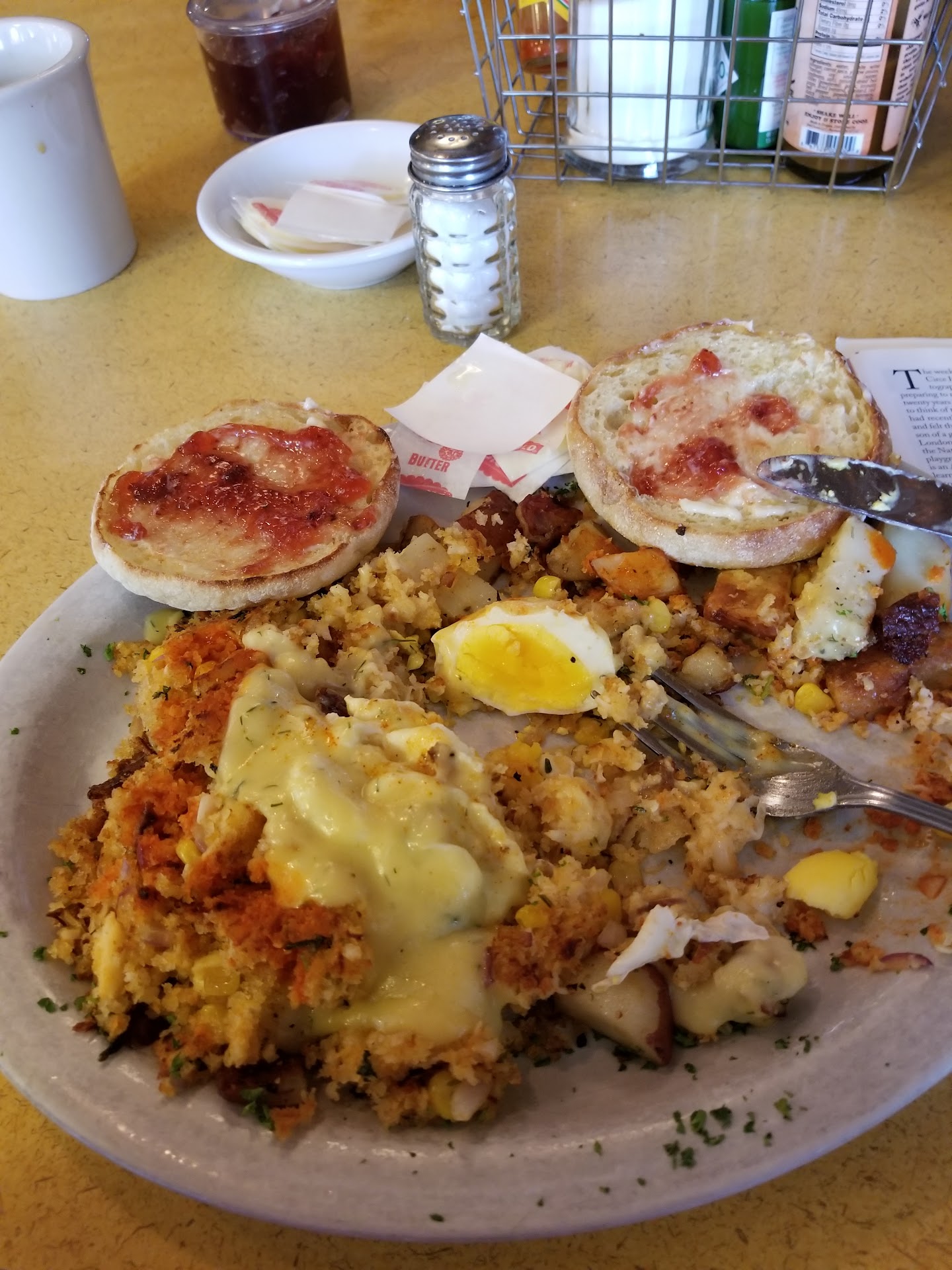 I wasn't able to get there early as I usually do to avoid the crowd and wait, but the staff grab me and immediately put me at a spot on the counter so I had no wait at all. I had the crab hash, but unfortunately the waitress either didn't hear me or the cook missed the instruction to poach my eggs hard, so it went back for a redo, and everything was fine from there on out. My coffee was kept full, which is an occasional issue here when they are busy. Maybe that's one advantage of sitting at the counter? In any event, overall another successful visit to a neighborhood standby with very friendly staff, and generally consistent food. I might say this restaurant could benefit from a chalkboard with rotating specials to change things up a little bit more so regulars don't get bored and occasionally...