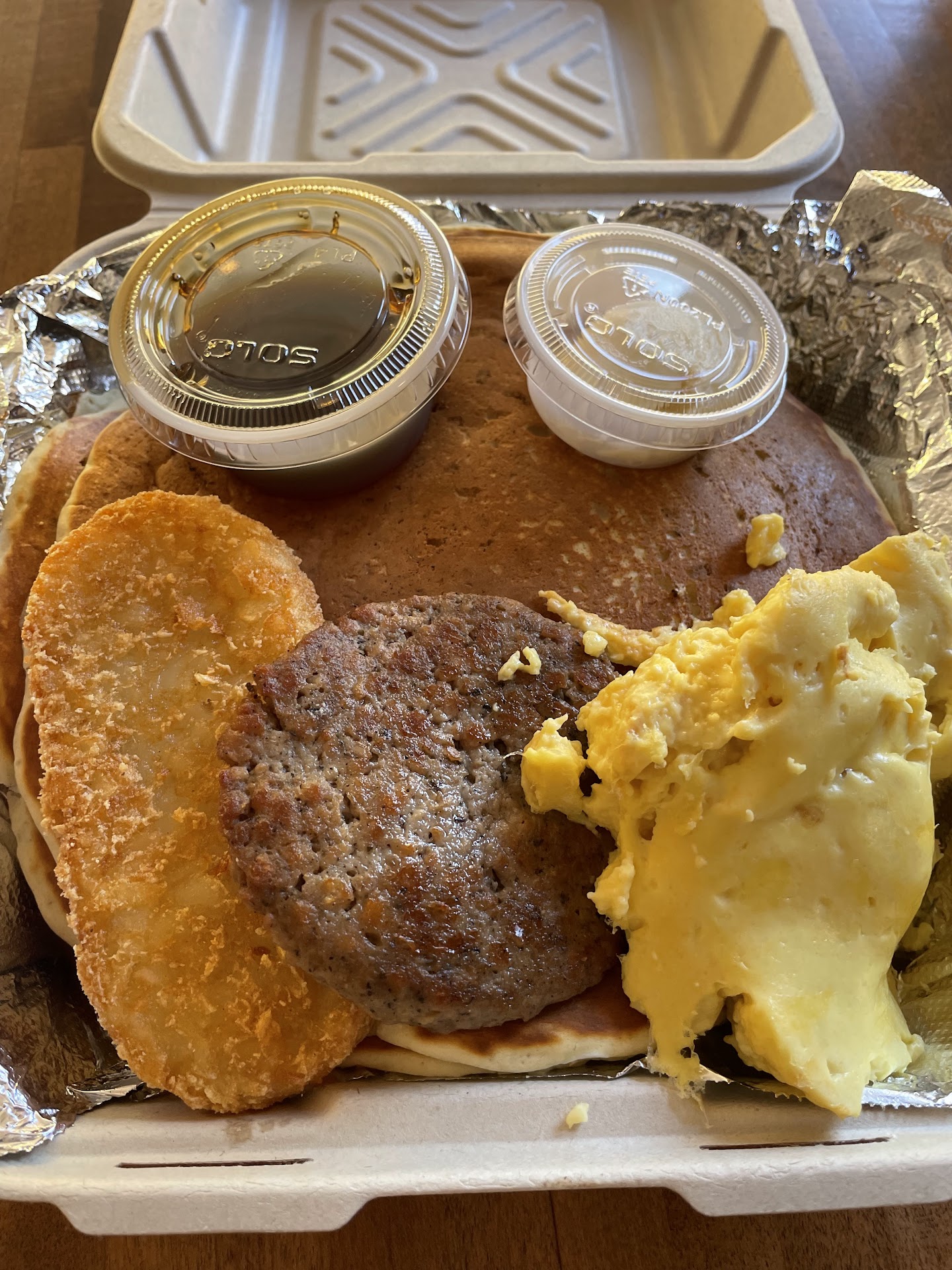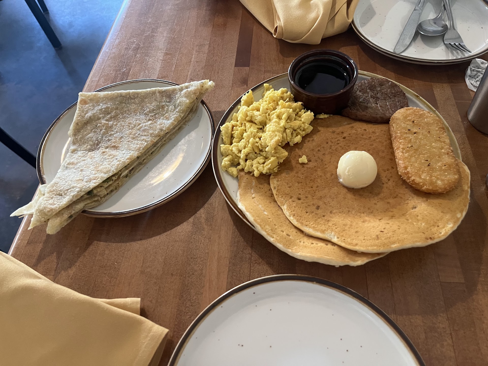 The pancakes had great texture and were cooked well, but the batter was too salty. There was an overall bitterness to it, and it only tasted good with a heavy amount of maple syrup, which should not be the case.