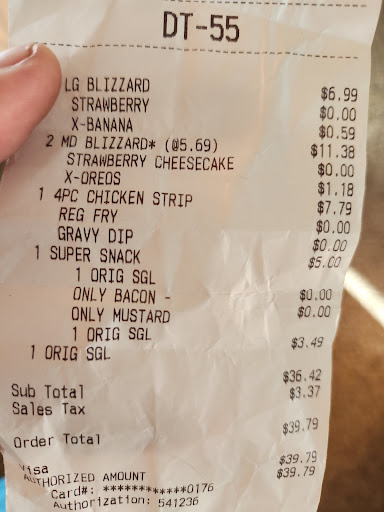 Read moreAbsolutely the worst, Dairy Queen I've ever been to! No star rating at all for service!!!! Took my mother-in-law for a snack and ice cream inside. Girl at the counter had about as much gumption as a sloth! As we were trying to order, she was taping her fingers on the register like we were a nuisance. She kept ignoring what we were trying to order because a police officer pulled someone over in their parking lot. After we finally got the order in, a 2 for $5, (2 chicken stripes and fry), that took almost 20 minutes to receive, and I had to go up to the counter to request it!!! The other order, a burger and fry, were sitting on the window under a heat lamp the whole time... fry was cold, so I had them remake the fry......