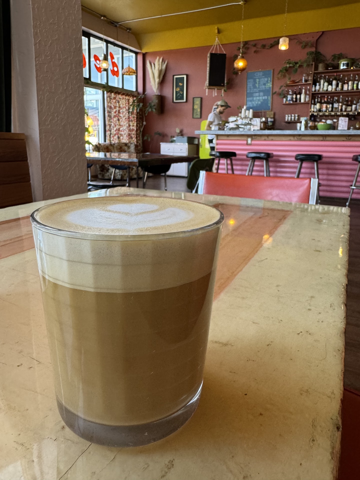 It has a bar top but is set up with big tables for groups, two-tops, couches making for a chiller, quieter space. People were there for a catch up, to study, work on craft projects, and meet up with a group of friends for a drink. It feels like you're at home. The decor is amazing too. Homey from the 60s 70s? And a projector playing weird movies but it's a good conversation starter or distraction if you need it. Definitely check out the bathrooms.