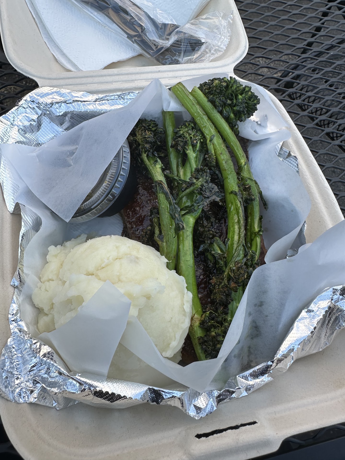 Rib eye āāāā this was good, specifically the sear?!? Don't expect something gourmet, but expect a solid steak didn't specify doneness but they did medium which I appreciated for this I usually can't eat the fat on steak but this one melted I'd order it again if I was in the mood for it broccolini with it was super juicy and crisp the mashed potatoes hit the spot, they were so buttery