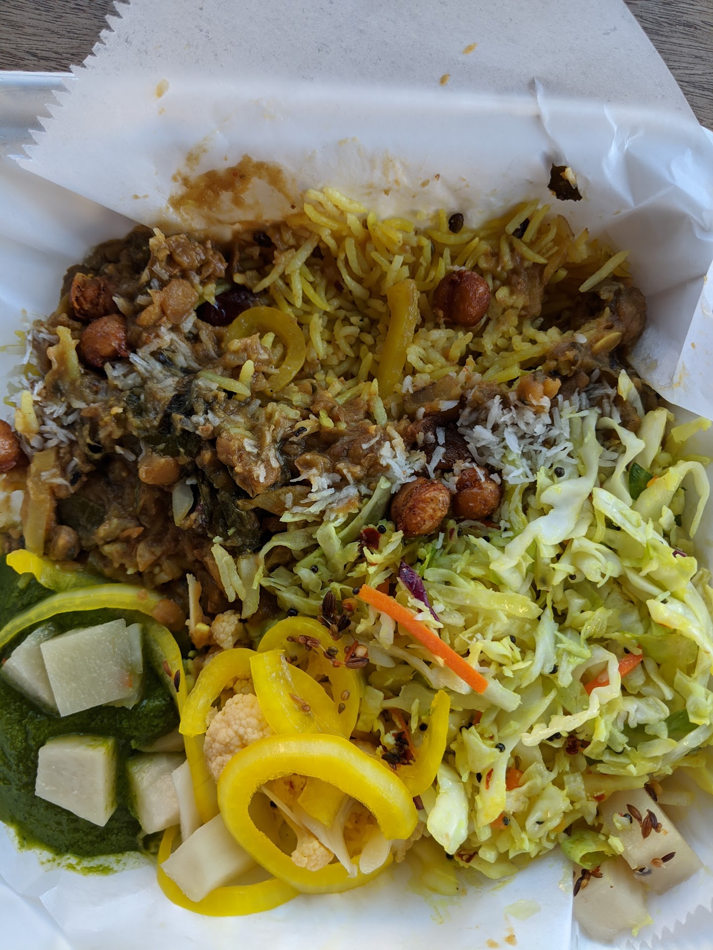 I've eaten here, as well as Masala Lab, many times. The flavor profile is just incredible, I really haven't had anything else like it. I'm always impressed. Yesterday I had a pulled pork plate and it was divine, especially the housemade pickled vegetables, they really just highlight all the flavors. My husband would only let me have one bite of the lamb, I will be getting that next time - it was delicious! I am a budget conscious person and sometimes I balk at the price of eating out these days, but I have to say that the generous size of the portions (I will have this one meal for 3 lunches!) makes it come out at a totally reasonable price, plus the quality is just outstanding. This is a food cart but it is in a really sweet location with nice covered seating, heaters and a full bar available. I definitely recommend it for a meal out, plus I heard they cater which I am hoping to...