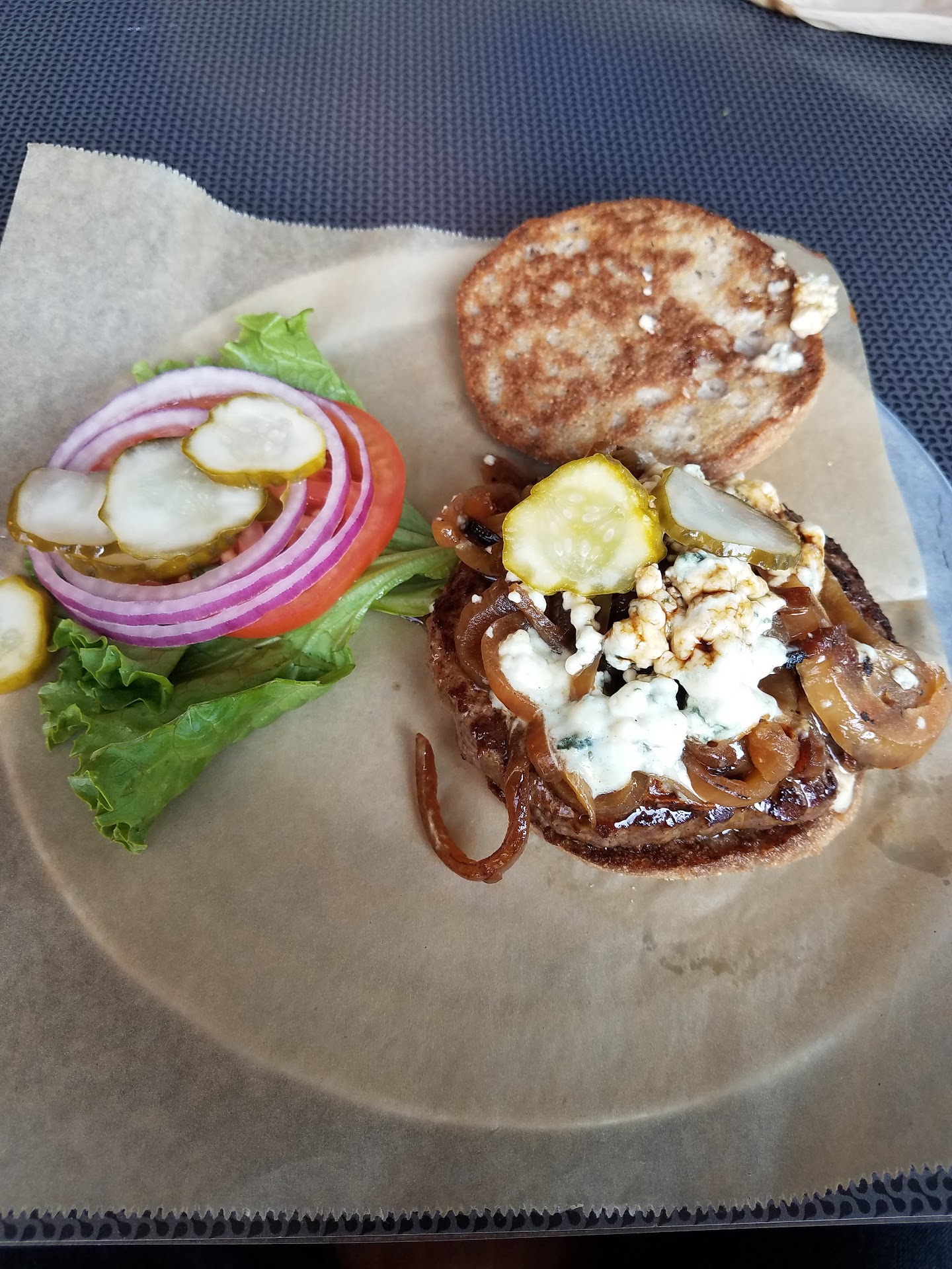 I had a venison burger with onions and goat cheese on a keto bun,and my husband had the beef patty with grilled onions, cheddar and bacon.