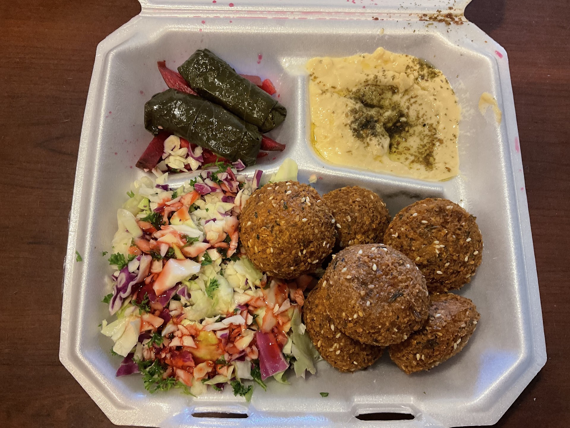 We had a very similar sounding experience to another reviewer here. We went in the afternoon when no one else was there - we were the ONLY customers. Ordered falafel plate and some other things. Got back to our hotel about 10-15 minutes later only to find one of our things missing from the order (again, not busy, no other customers). We called the restaurant immediately to find a resolution only to be met with the owner 1) first claiming to not have any idea who we could possibly be (I doubt they had a swarm of customers in the interim), 2) then claiming we never ordered the item in the first place and therefore, 3) we weren’t charged for the item. Let me tell you - when you’re ordering in the restaurant in person, you both know exactly what you’re ordering and what you’re paying for. But, as I continue to warn my family, check your order before you leave anywhere as there are always unreputable business owners waiting to rip you off. After trying to talk reasonably with this guy, it was obvious he wasn’t going to admit his mistake or refund our money for the missing item. But, I’m warning anyone reading reviews here, just go elsewhere. I’ve included a before and after picture of the food we got - see how much we just threw away because it was such poor food. The falafels were okay, but the hummus was sour and gritty, the “salad” was some disgusting cut up cabbage mess, the dolmas were mushy and gross, the garlic naan was flavorless and the two desserts were okay but certainly not great....