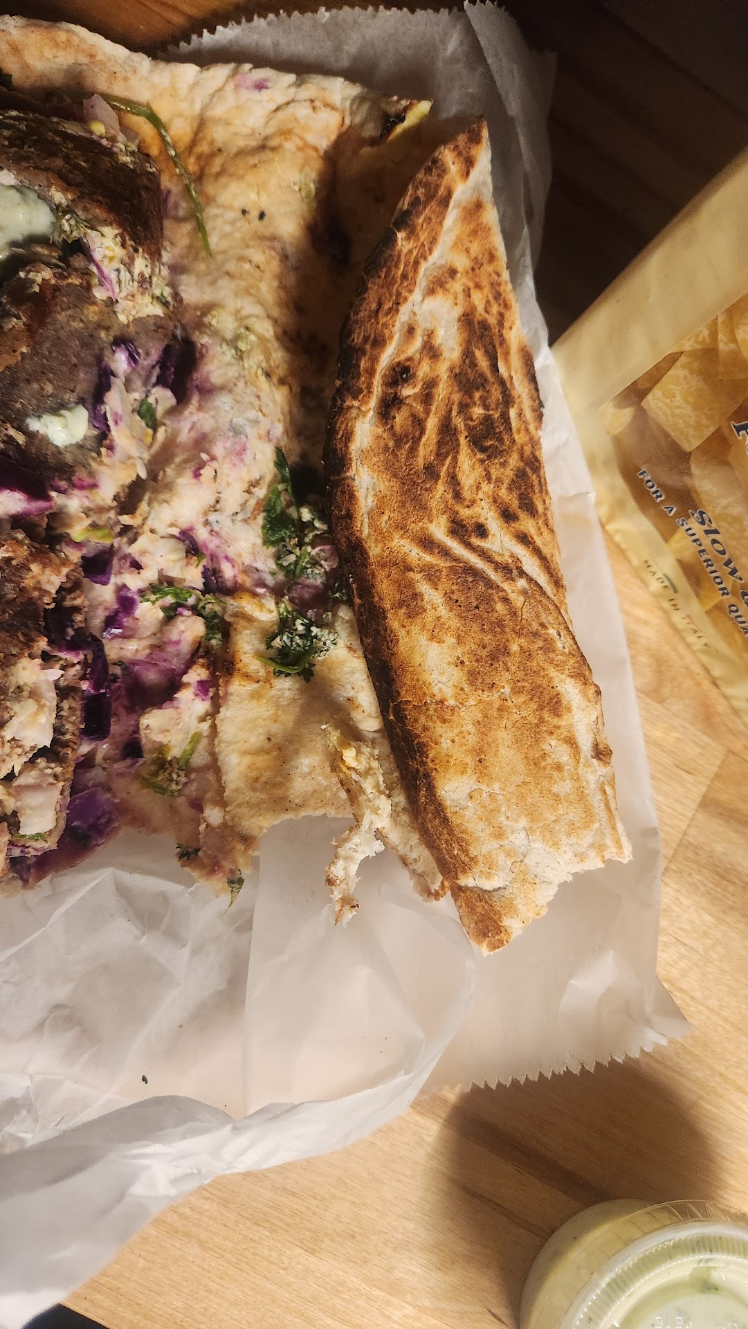 The flat bread is bagged and for sale in baskets and the baklava is kept heated so it's perfectly warm when you bite into it. The wraps are huge, at least a foot long. We had chicken shwarma and the gyro. The owner instructed his employee to make sure the fillings were end to end across so that the patron had a full 1st bite of meat and veg and not just wrap.