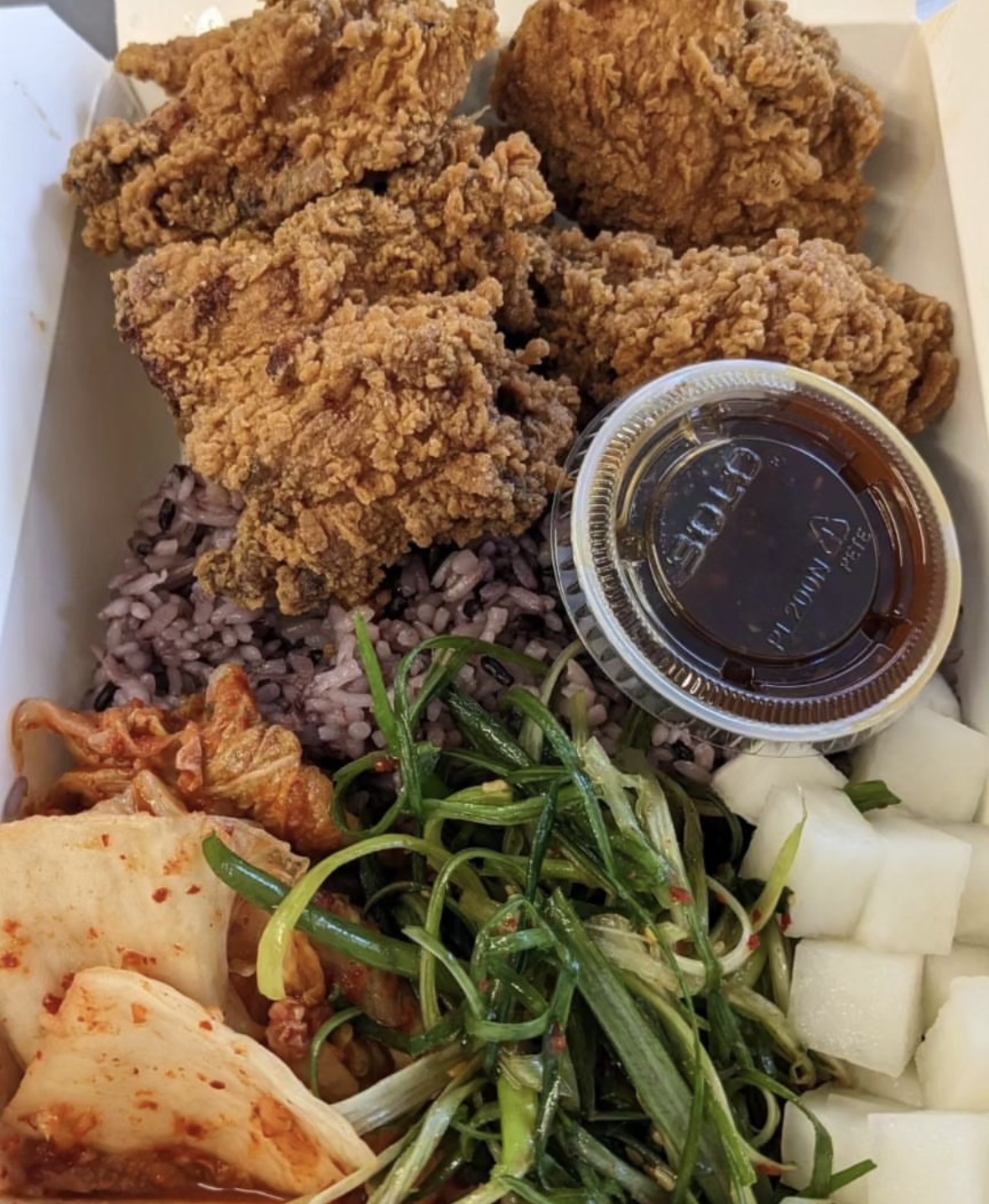 Small menu specialized in korean fried chicken and pork belly "bowls"(see pic) in a generous and beautiful portion. Sides are awesome heukmi bap (black and white rice but looks purple), perfect pickled cubed daikon radish, a green onion salad that is similar to seaweed salad but blows away the costco premade stuff most places use, and a kimchi that is mild on heat, garlic, and ginger but still great.