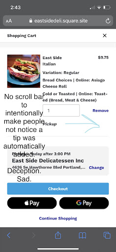 This place is intentionally deceptive to get customers to unknowingly tip. The checkout page doesn’t show a scroll bar on the right of the page, purposely leading people to not notice that the page scrolls down. On iPhone, websites don’t show the scroll bar unless you touch the screen and start to scroll then the scroll bar animation appears. Not on their website though. No scroll bar animation no matter what you do. If you scroll down you’ll see a tip is automatically added. Absolutely despicable. You lost a customer for life you deceptive greedy business! Pay your employees instead of deceiving customers to tip. It’s counter service. You make a sandwich and then as a customer I walk up to the window and pick up my food. You place your order online and don’t even interact with the staff. What did you do to warrant a tip? Shake my head to your embrace of greedy toxic tip culture. If I sat down and was served, then that’s different. Zero stars.