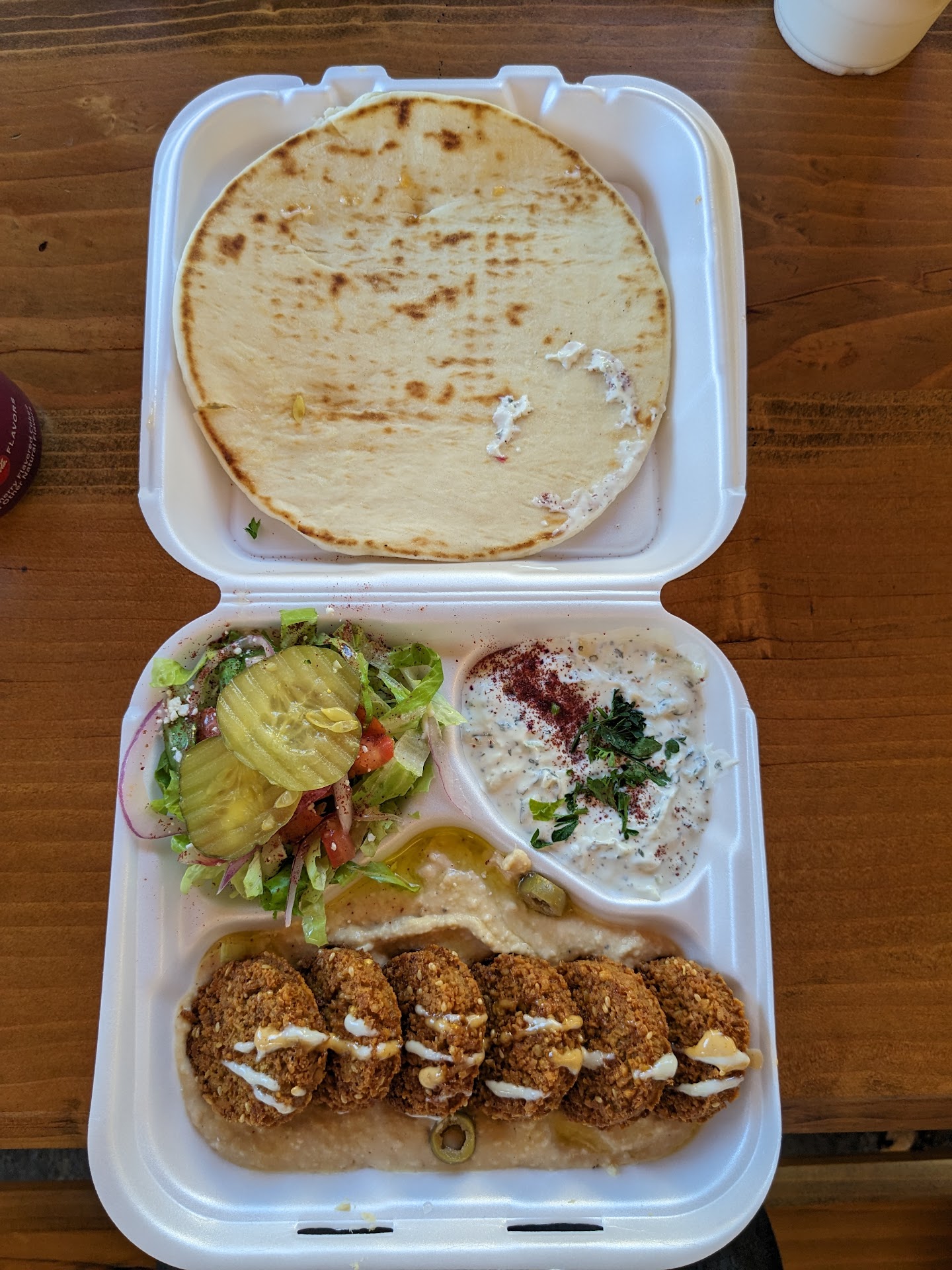 Read moreStopped by here during a snow storm so the fireside table was much appreciated. Food was amazing, we got falafel plates and seriously some of the best falafel I've ever had. The hummus was melt in your mouth good. Also got bubble tea which was good and kept the kids from becoming demons while we waited for our food. Super stoked this food cart pod opened near us and will be back. Came another time for English muffins at Sunrise bakery that were nothing short...