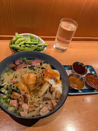Amazing ramen noodles. Edamame 🫛 was absolutely killer! Kim chi was great, little tongue tickle and perfect spice. Loved the food and service!